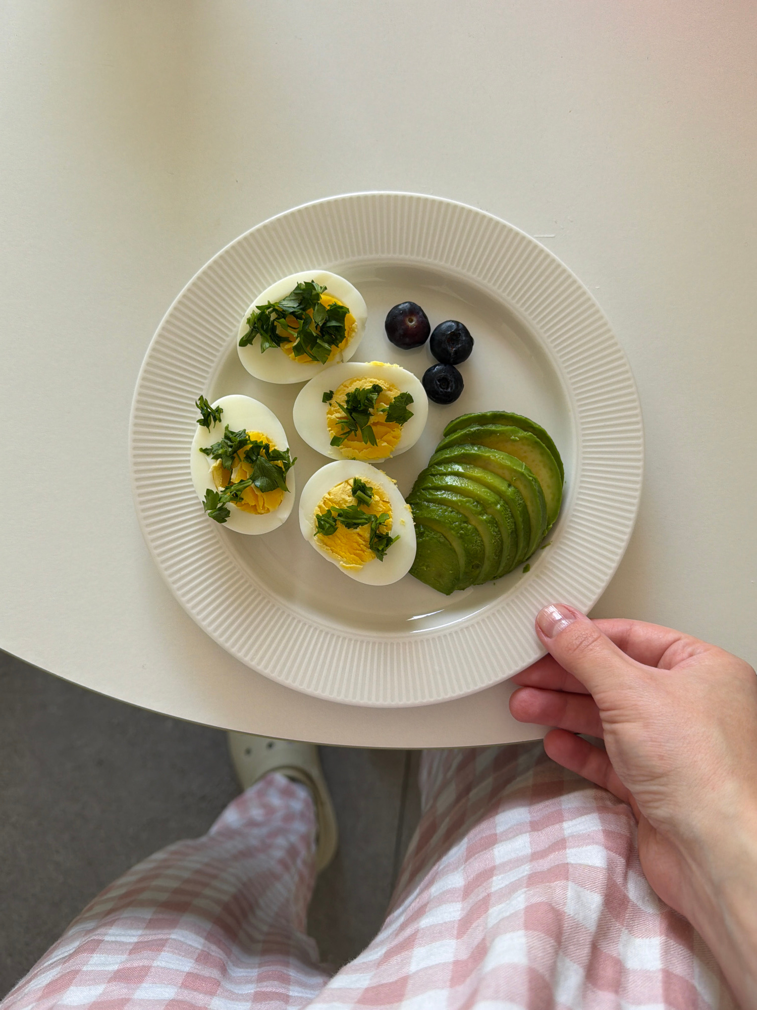 A top-down shot reveals a plate of food placed on a white surface, likely a table. The plate contains four halved hard-boiled eggs topped with chopped green herbs, a stack of avocado slices, and a few…read more
