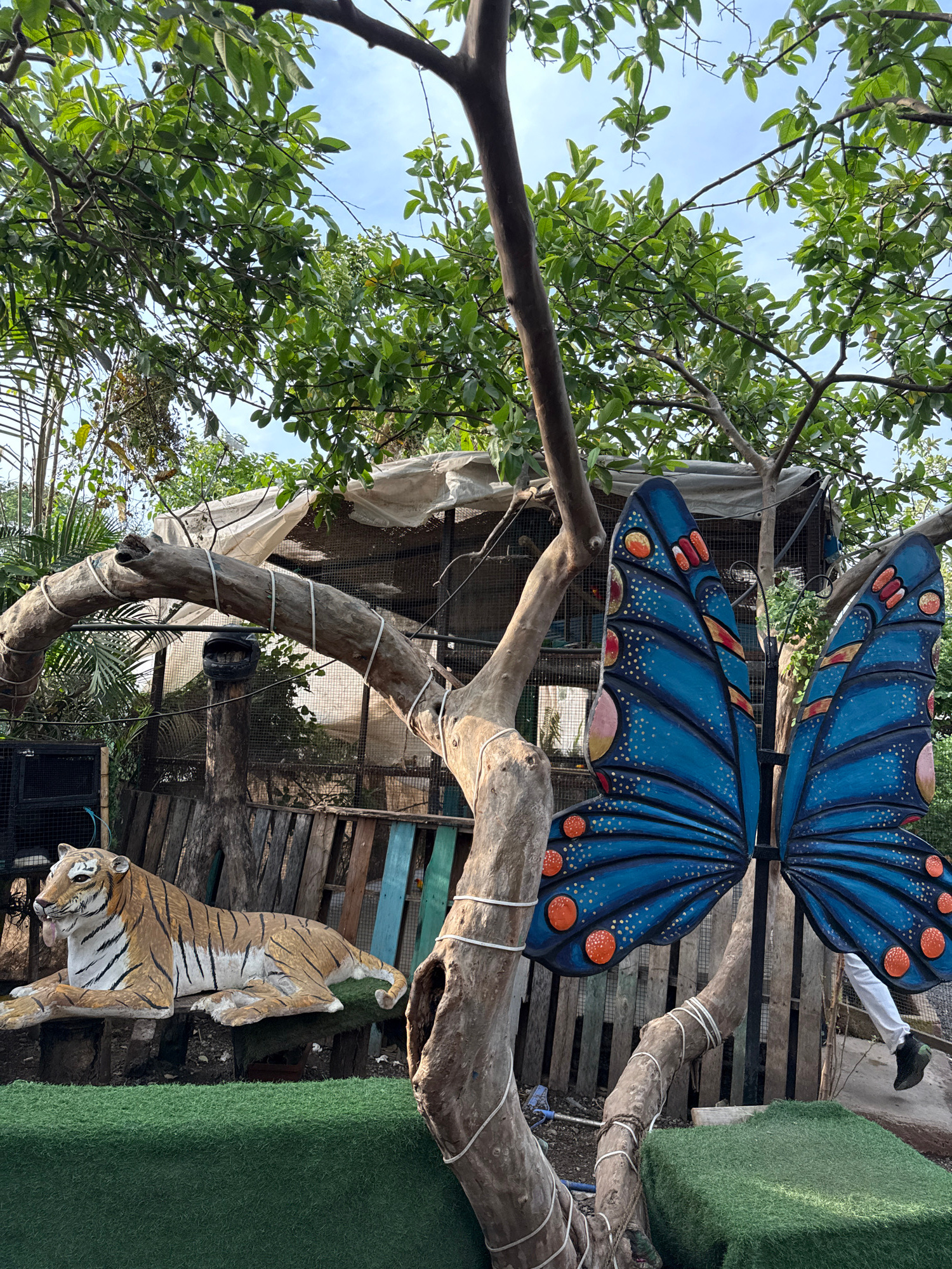 This image captures an outdoor scene, potentially within a park or recreational area. The primary focus is a large, artificial tree trunk made of gray wood. This tree is adorned with a large, blue, pa…read more