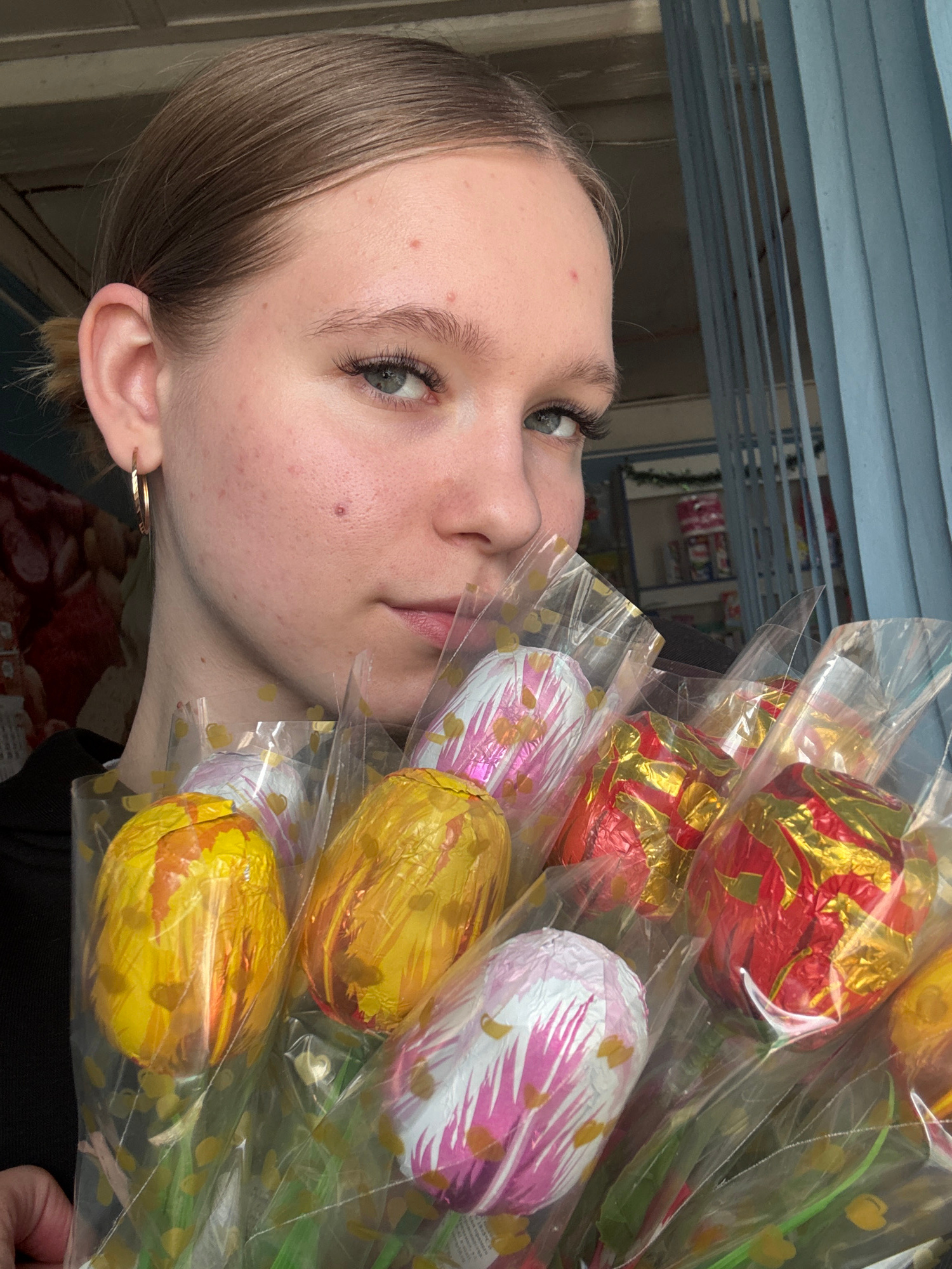 A fair-skinned young woman with light brown hair and visible acne on her face is holding a bouquet of individually wrapped, colorful chocolate tulips. The tulips are wrapped in clear cellophane with g…read more