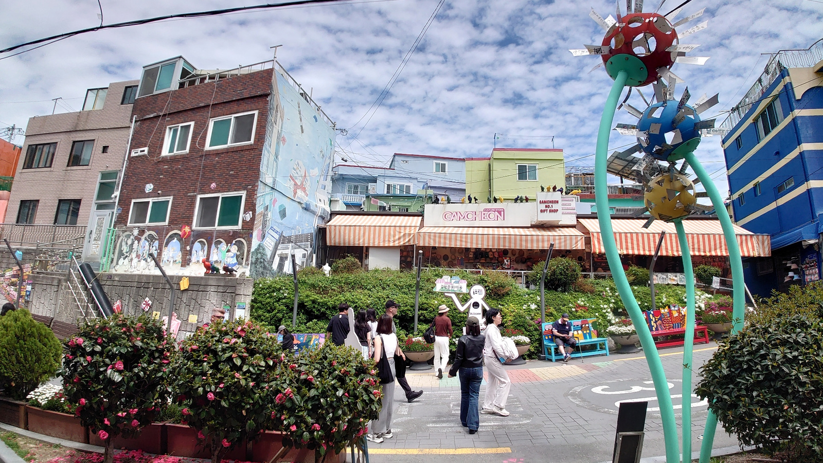 The image depicts a street scene in Gamcheon Culture Village, located in Busan, South Korea. In the foreground, there are flower bushes in containers, and a colorful sculpture of metal pinwheels on gr…read more