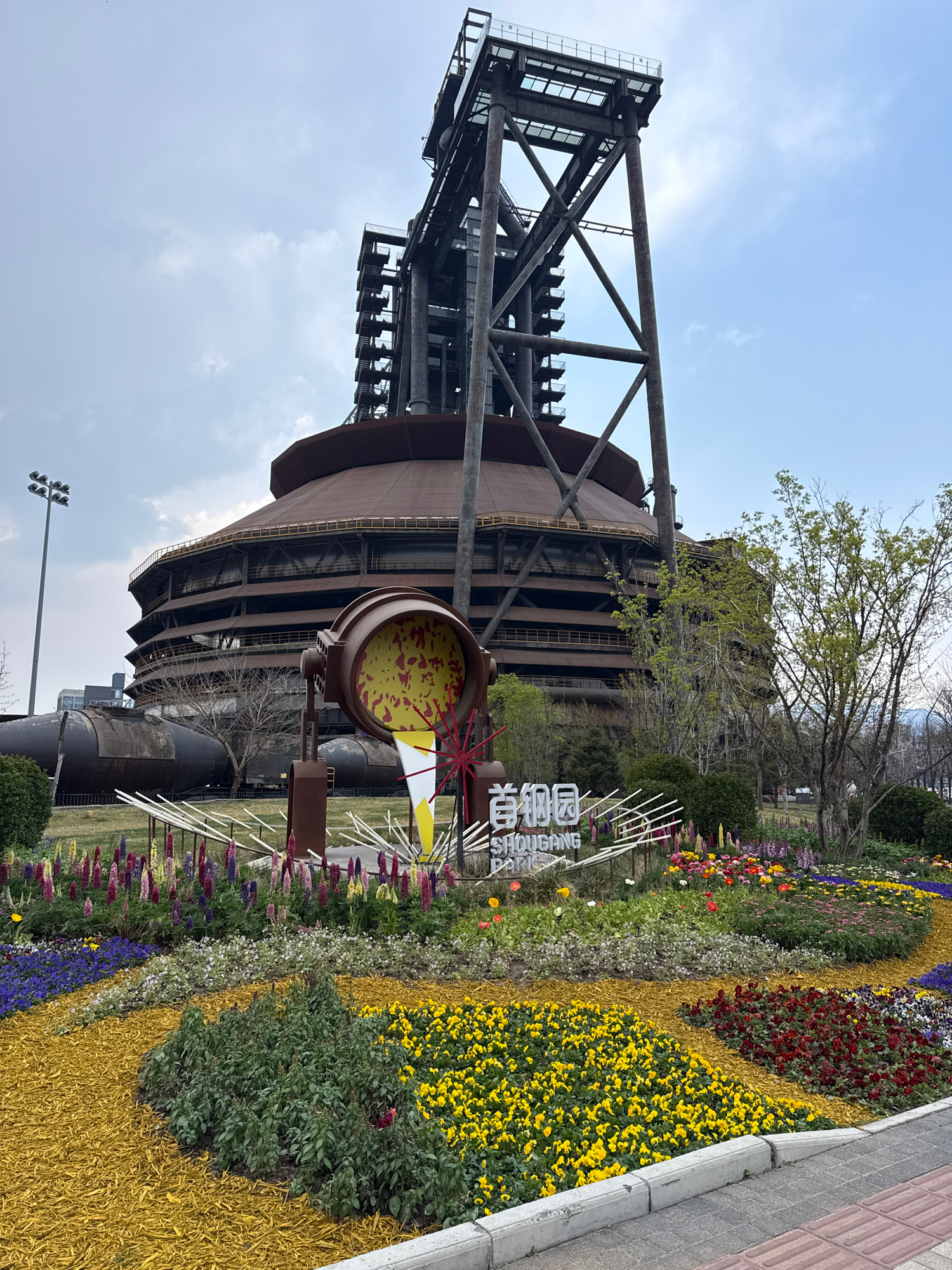 The image captures a view in the Shijingshan District of Beijing, China, specifically at the Shougang Park, a former steel mill site. The focal point is a large, rusted industrial structure, likely pa…read more