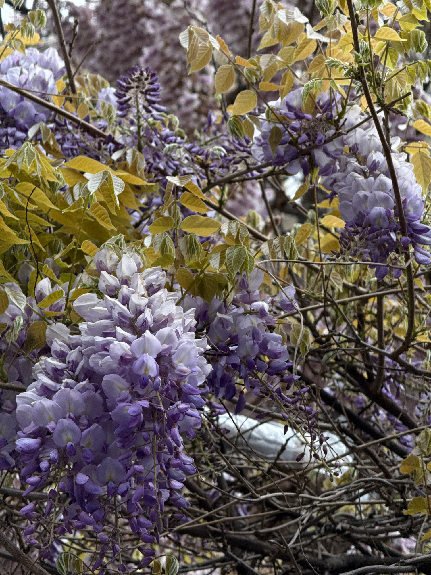 The image shows blooming wisteria vines with clusters of purple and white flowers and golden leaves, intertwined with bare branches. The location is Belgrade, Serbia. The scene is densely vegetated wi…read more