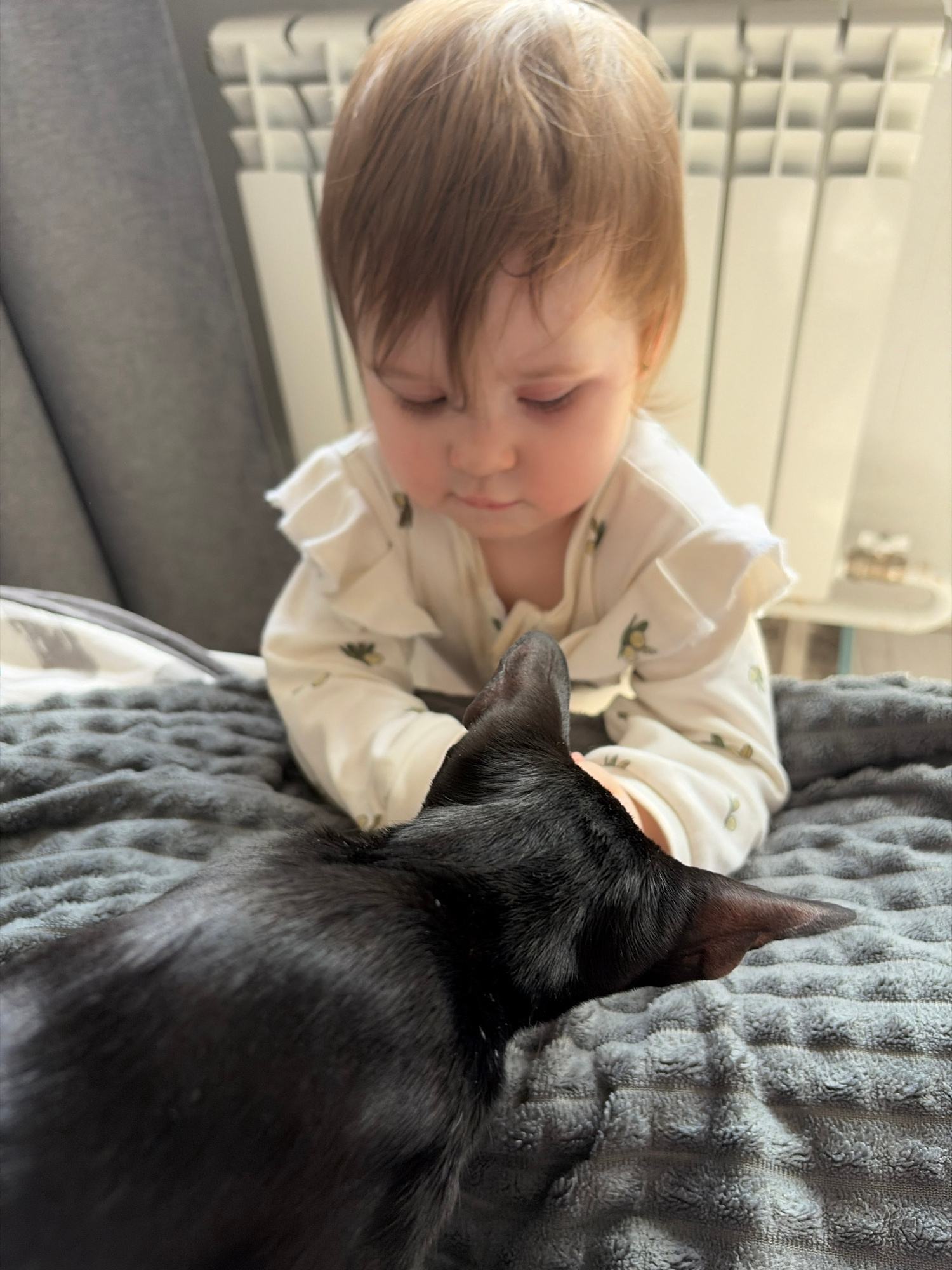 A top-down shot shows a child, likely female, with light brown hair, wearing a white long-sleeved shirt with a pattern, sleeping on a gray textured blanket. A black cat sits beside the child, its back…read more
