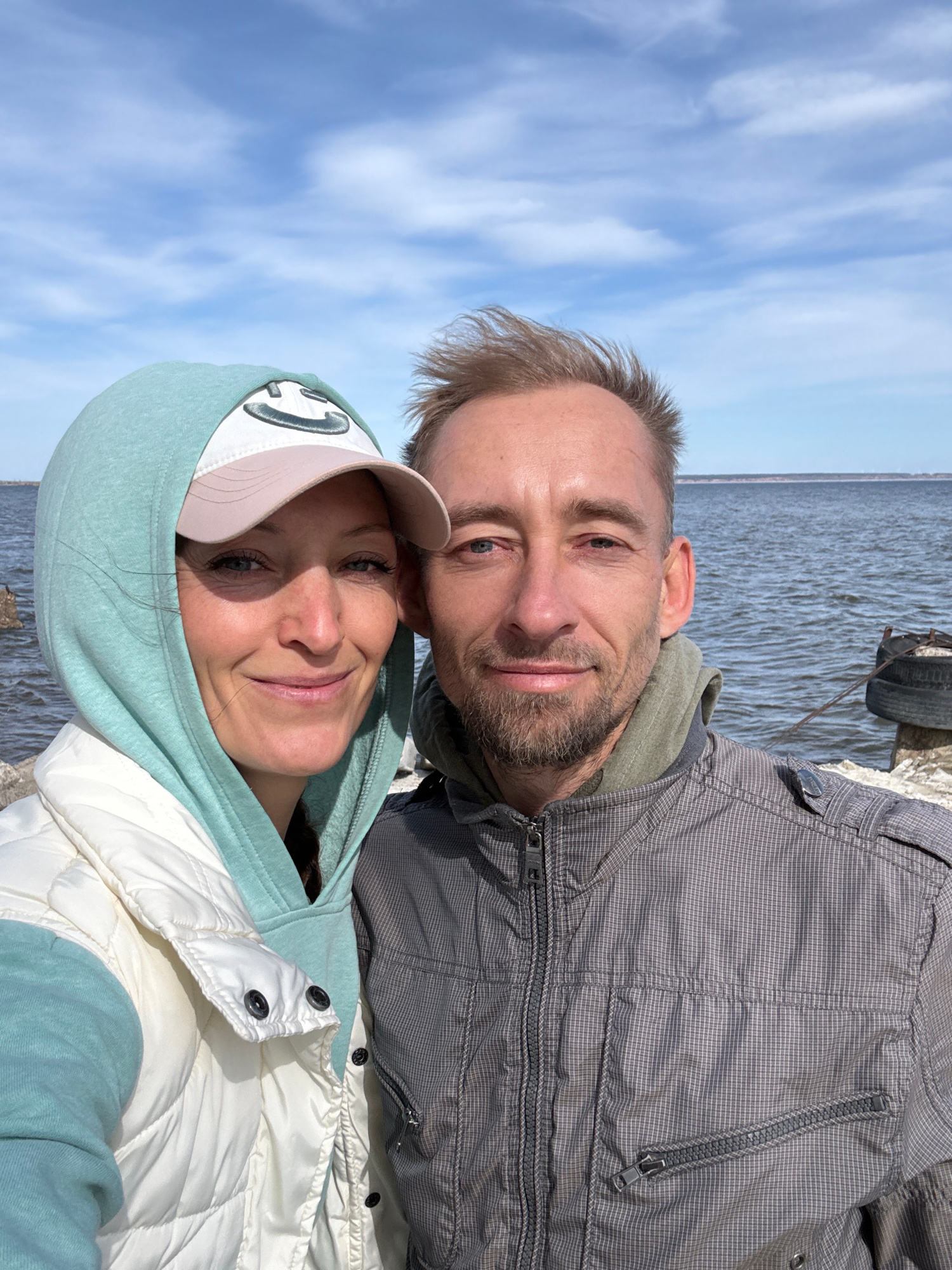 A man and a woman are captured in a bright, outdoor selfie-style portrait. The image is oriented vertically, showing the subjects smiling happily. The man, positioned slightly behind and to the left…read more