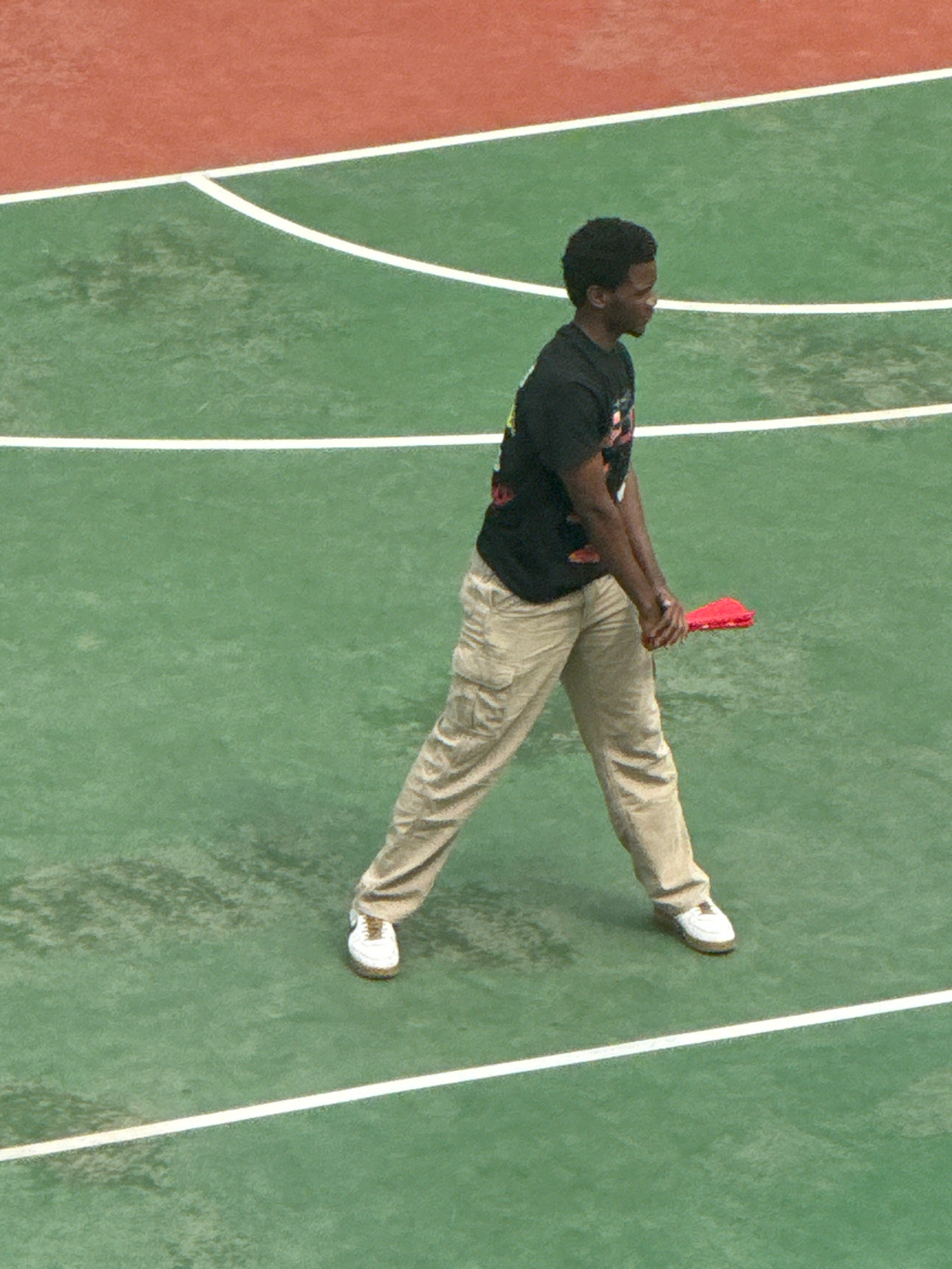 A man is seen from an overhead perspective on a sports court with green and red sections demarcated by white lines. The man, who appears to be of African descent, is wearing a black t-shirt with a gra…read more