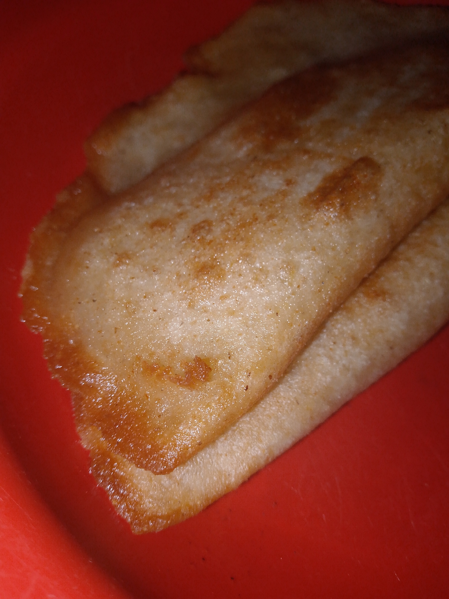 The image shows two crepes stacked on a red surface. The crepes have a light brown color with a slightly golden hue around the edges. The surface texture of the crepes appears slightly porous. No peop…read more