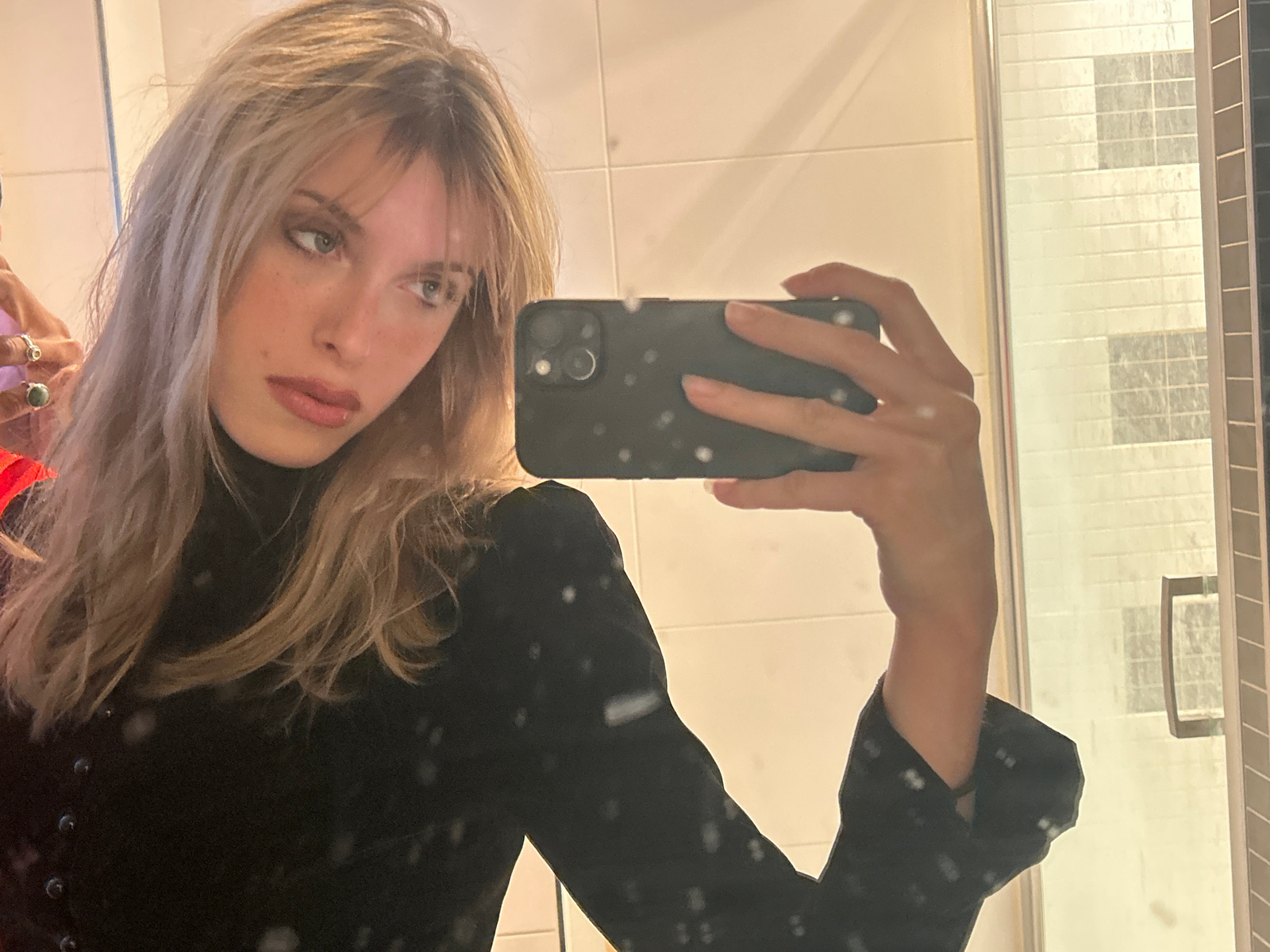 The image is a selfie taken in a bathroom. A woman with blonde hair, wearing a black turtleneck shirt, is holding a black smartphone in her right hand to take the picture. The background features light-colored bathroom tiles and a shower door with a metal handle. The woman is fair-skinned with freckles, and her gaze is directed slightly away from the camera. Another person’s left hand is partially visible in the left of the image, with rings on some fingers. The exact location in Pantin, France, cannot be determined from the image alone. | Open Wire