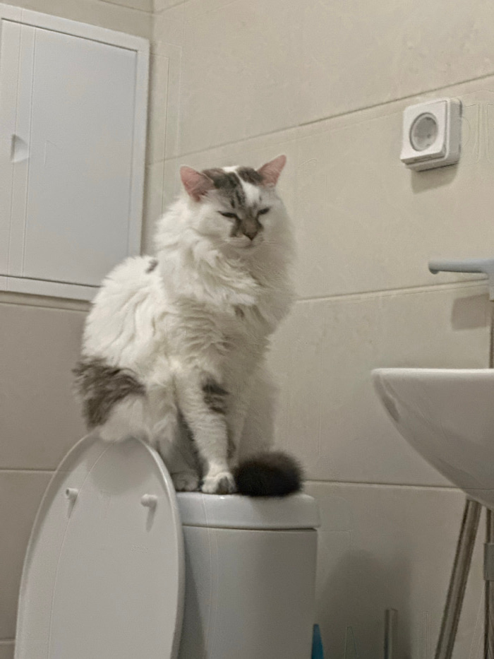 The image displays a domestic long-haired cat seated atop the tank of a white ceramic toilet in a bathroom located in Khimki, Russia. The cat's fur is predominantly white with several distinct greyish…read more