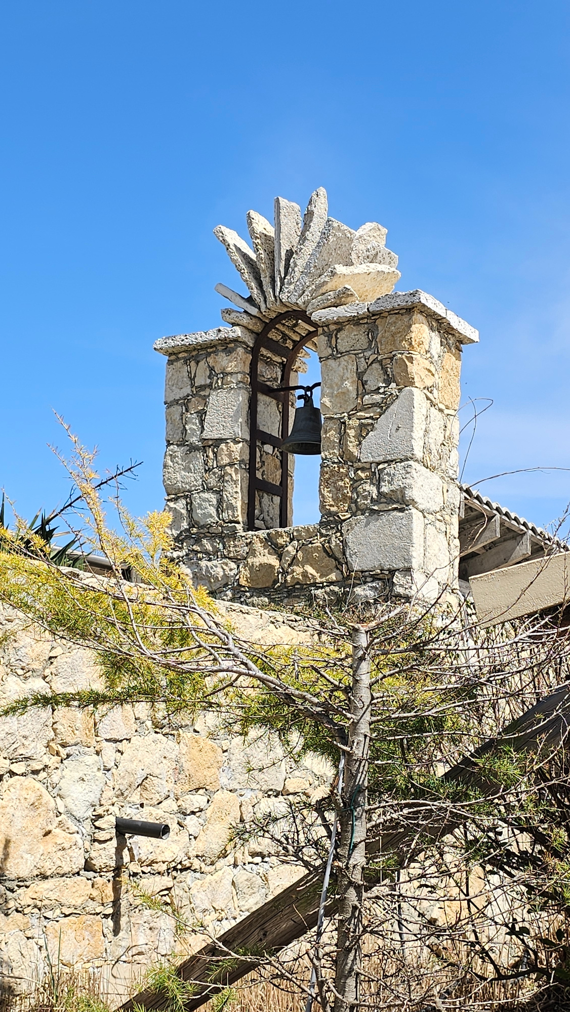 This outdoor image captures a rustic stone structure, likely a small bell tower, set against a vibrant clear blue sky in Varna, Bulgaria. The main subject is a sturdy bell tower constructed from irreg…read more