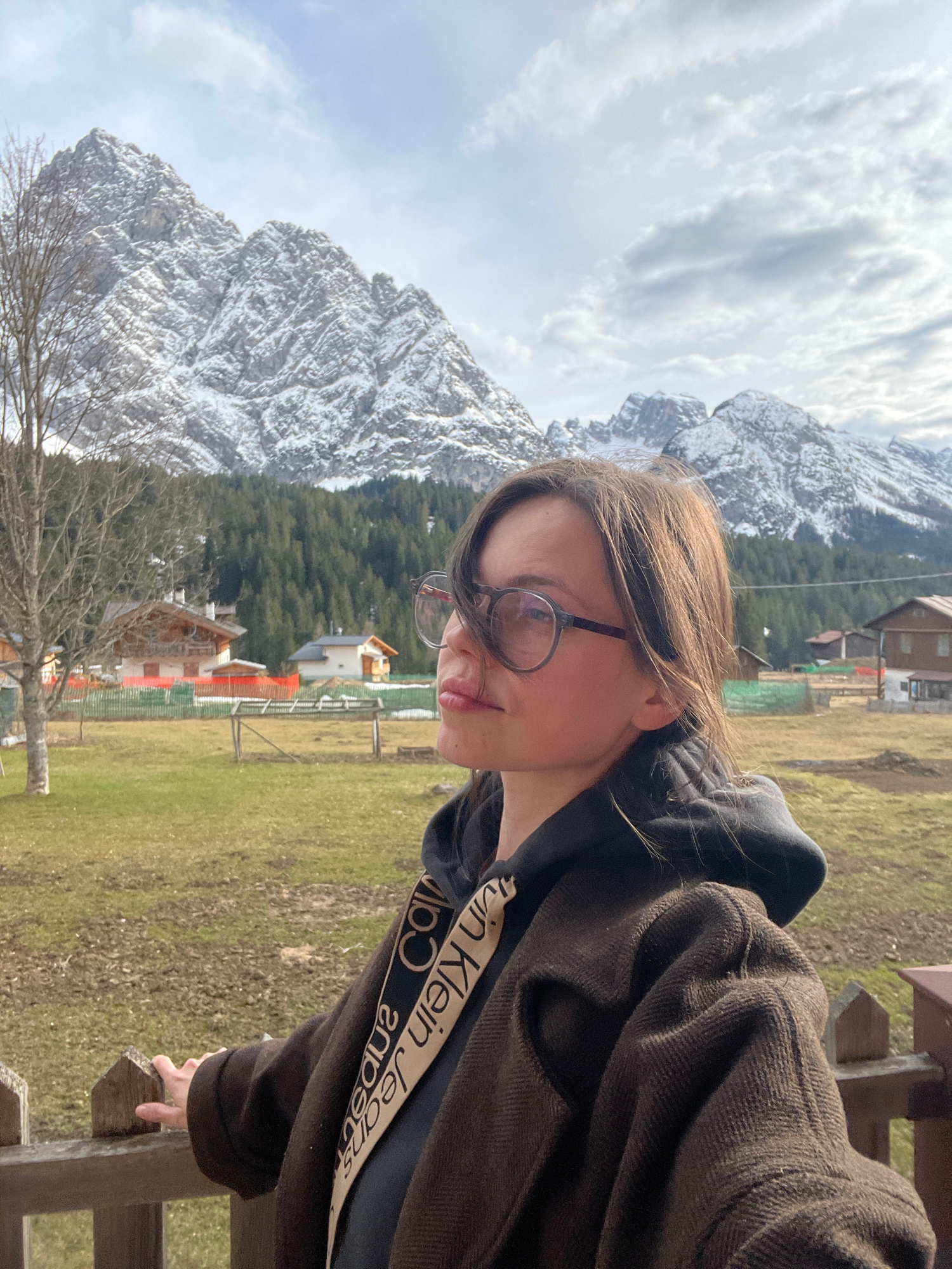 A person with glasses stands near a wooden fence. They are wearing a black hoodie with a Calvin Klein Jeans band and a brown jacket. In the background, there is a mountain range partially covered in s…read more