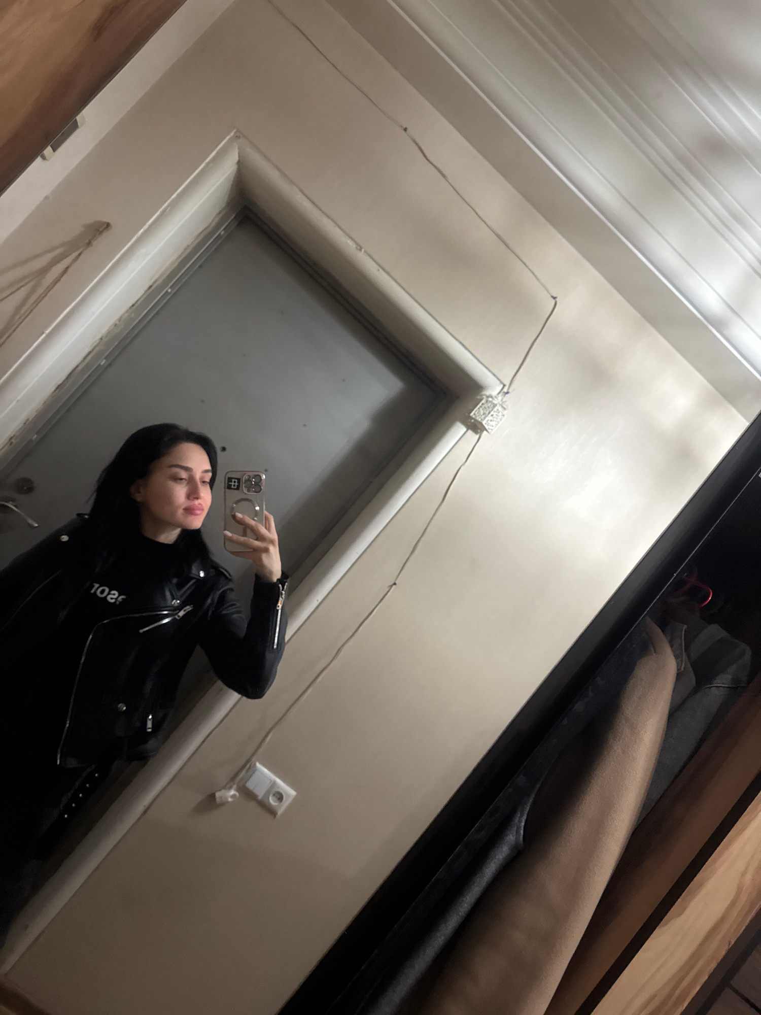 A young woman is taking a selfie in a mirror. She is wearing a black leather jacket. The location appears to be inside a building in Tbilisi, Georgia, as indicated by the Cyrillic characters on the ph…read more
