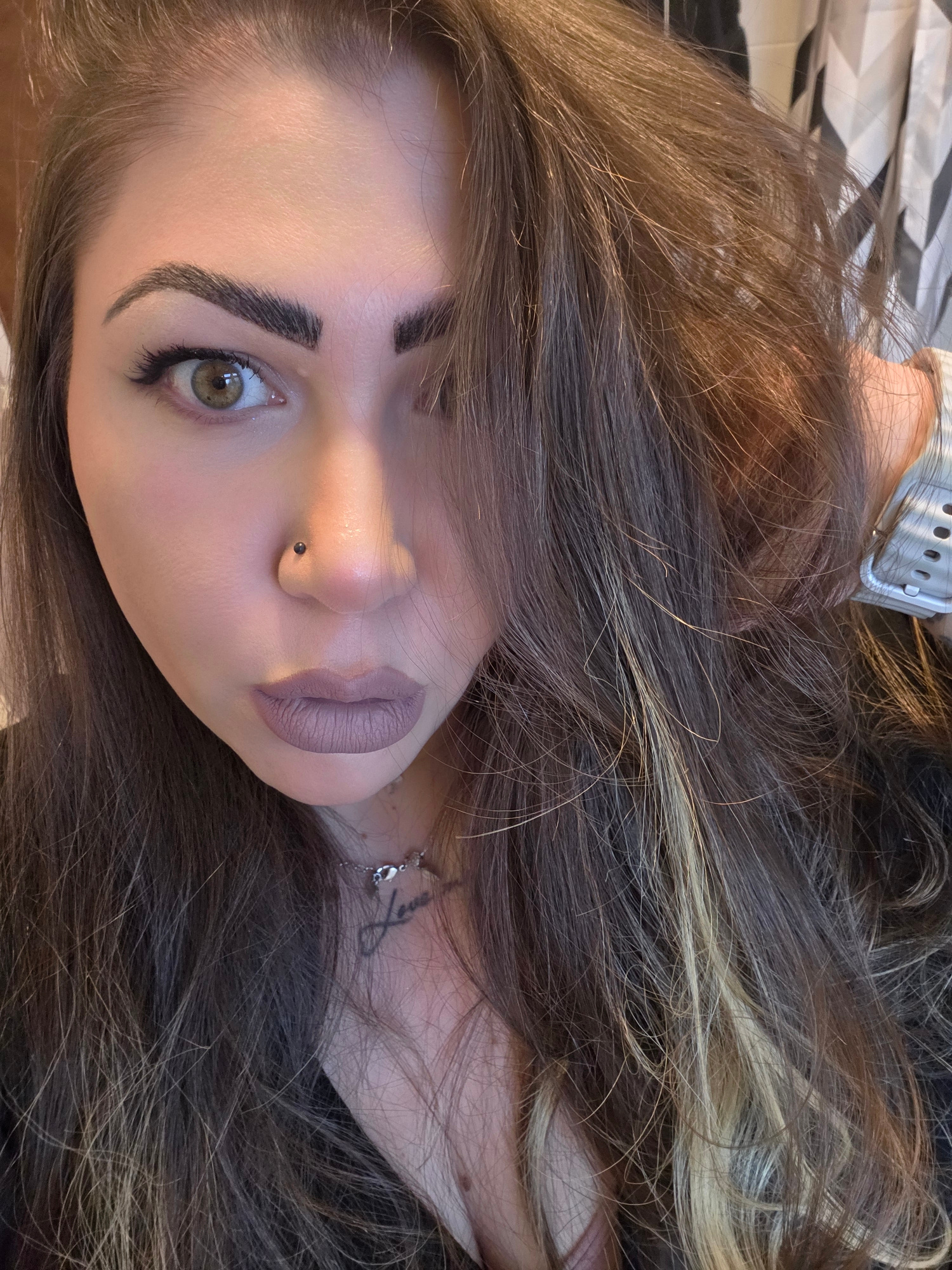 A close-up, angled portrait of a light-skinned woman with brown hair, lying down. Her hair is highlighted with blonde streaks. She has light brown eyes, prominent eyebrows, and a piercing in her left…read more