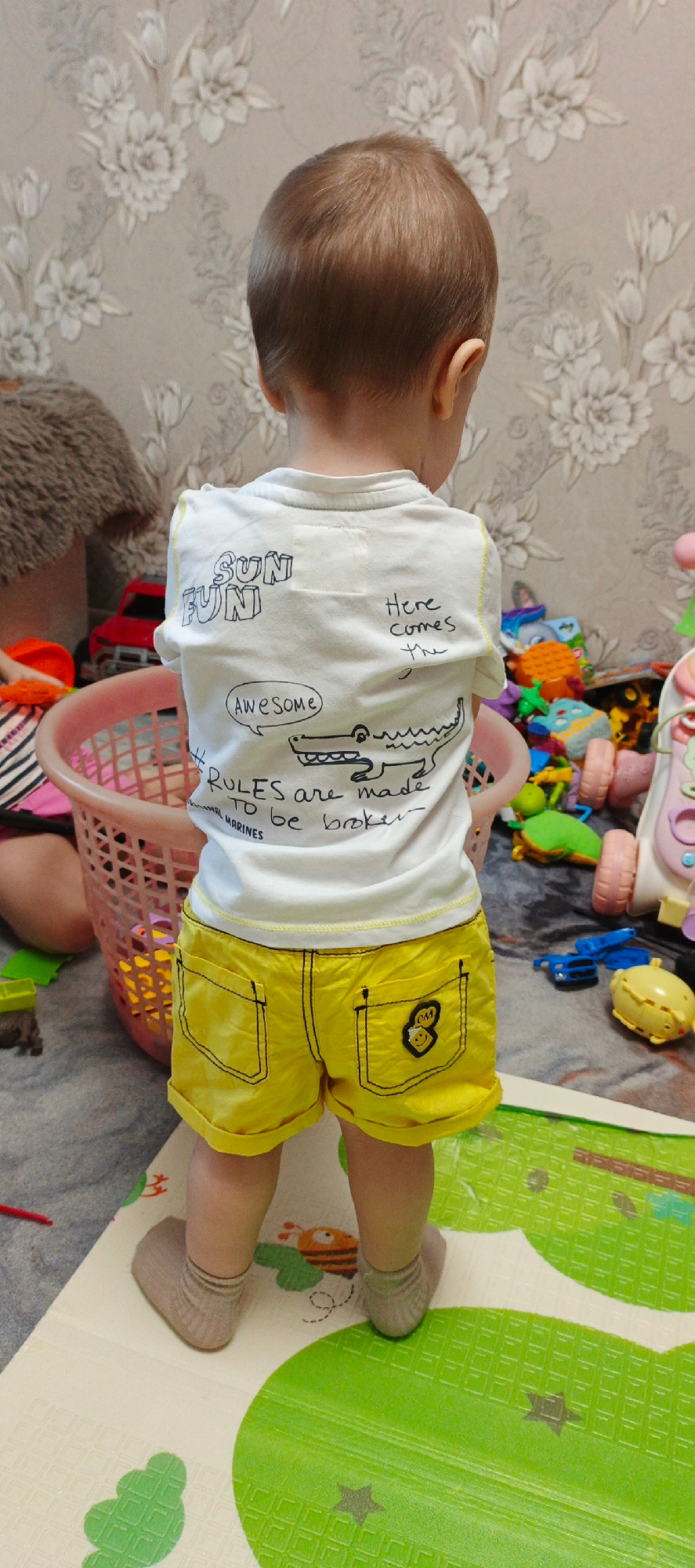 The image shows a young child standing on a play mat in a room. The child is facing away from the camera, wearing a white t-shirt with cartoon-like writing and drawings on the back, along with yellow…read more