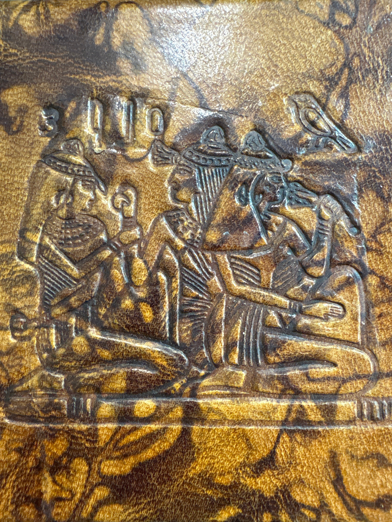 The image depicts a close-up of an embossed design on what appears to be leather. The design features figures in an ancient Egyptian style. One figure is seated and appears to be wearing a kilt, while…read more