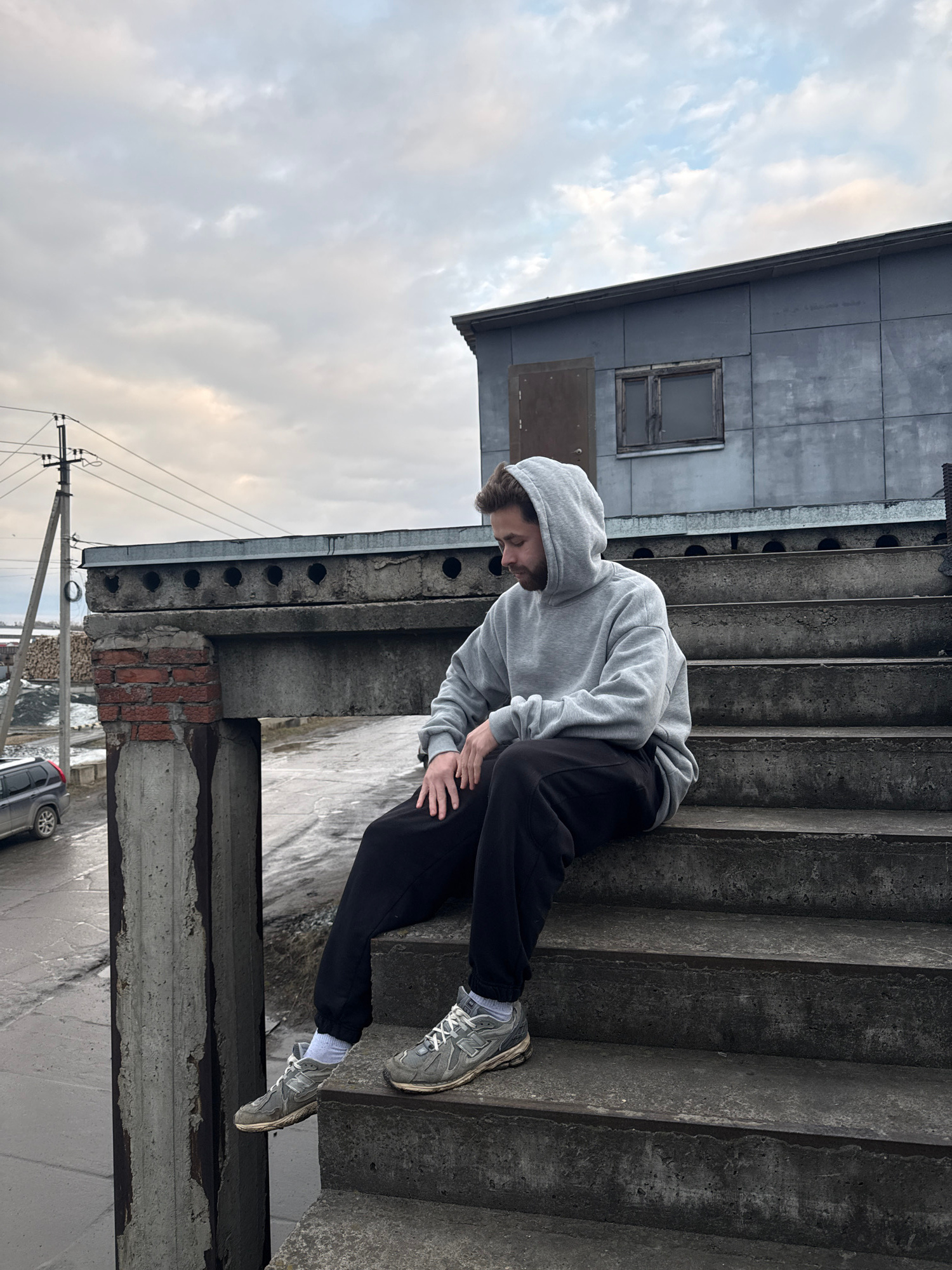 A man wearing a light gray hooded sweatshirt, dark-colored sweatpants, white socks, and gray sneakers is seen on an outdoor concrete staircase. The staircase appears to be part of a building; the manβ¦read more