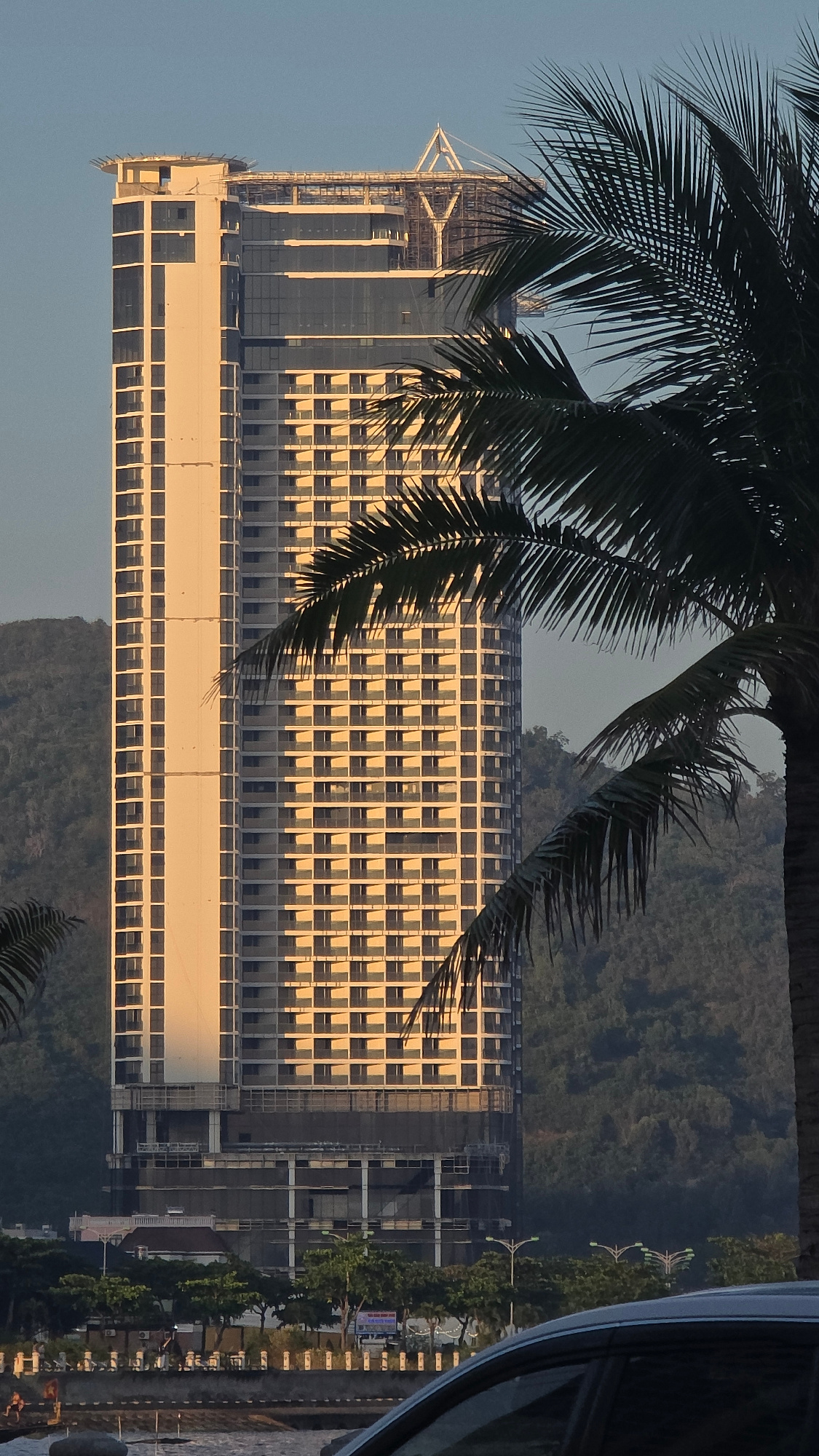 A tall, multi-story building under construction dominates the center of the image, illuminated by warm, golden light on its right facade, indicating either sunrise or sunset in Nha Trang, Vietnam. The…read more