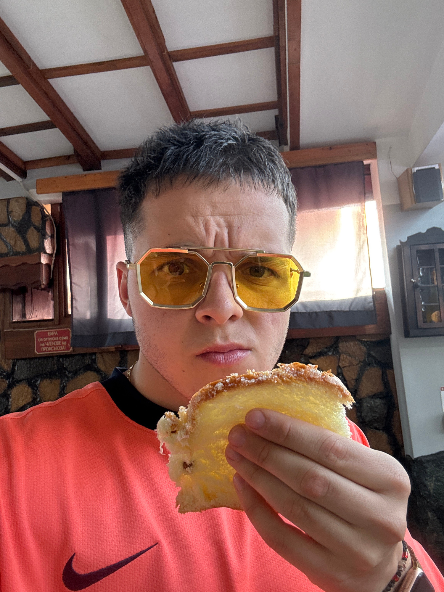 A sideways shot depicts a man wearing yellow-tinted glasses and a salmon-colored Nike shirt, holding a piece of cake. The setting appears to be inside a building with exposed wooden beams and a stoneβ¦read more