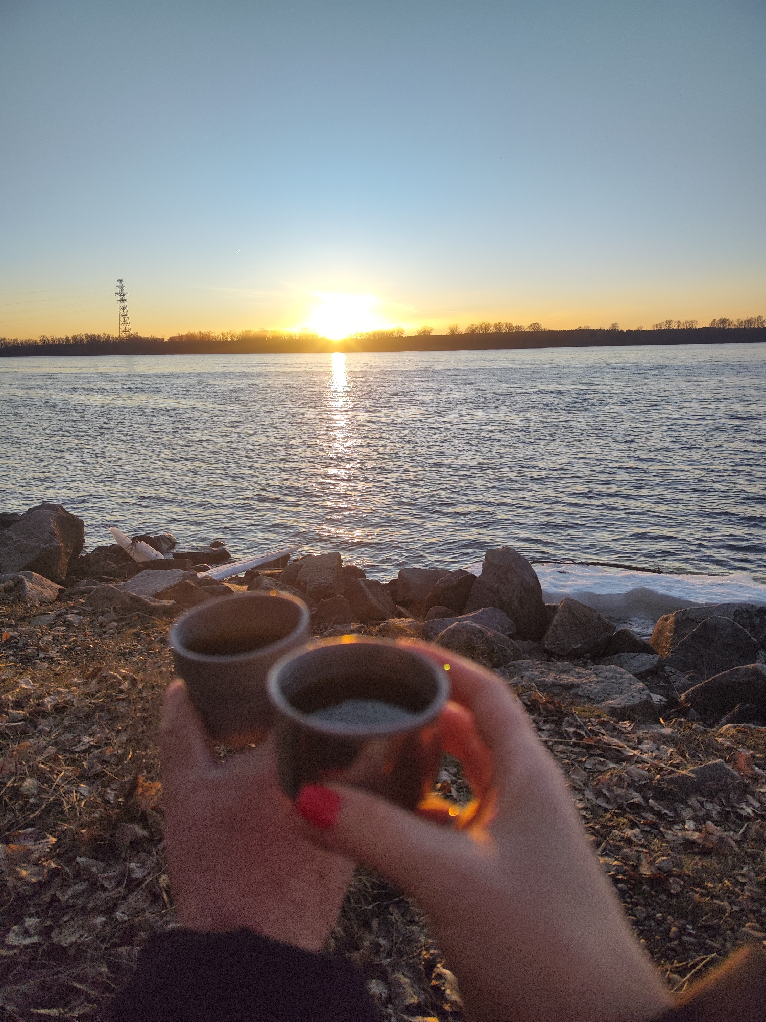 A slightly blurred, ground-level shot features two hands holding filled metallic cups against a wide body of water at sunset, with the foreground showing the ground covered in rocks and leaves. One ha…read more