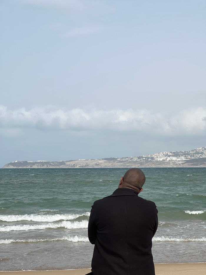 An individual, seen from behind, stands on a sandy beach looking towards the sea near Tangier, Morocco. The subject is an adult male with a bald head and dark skin, wearing a dark jacket or coat. He f…read more