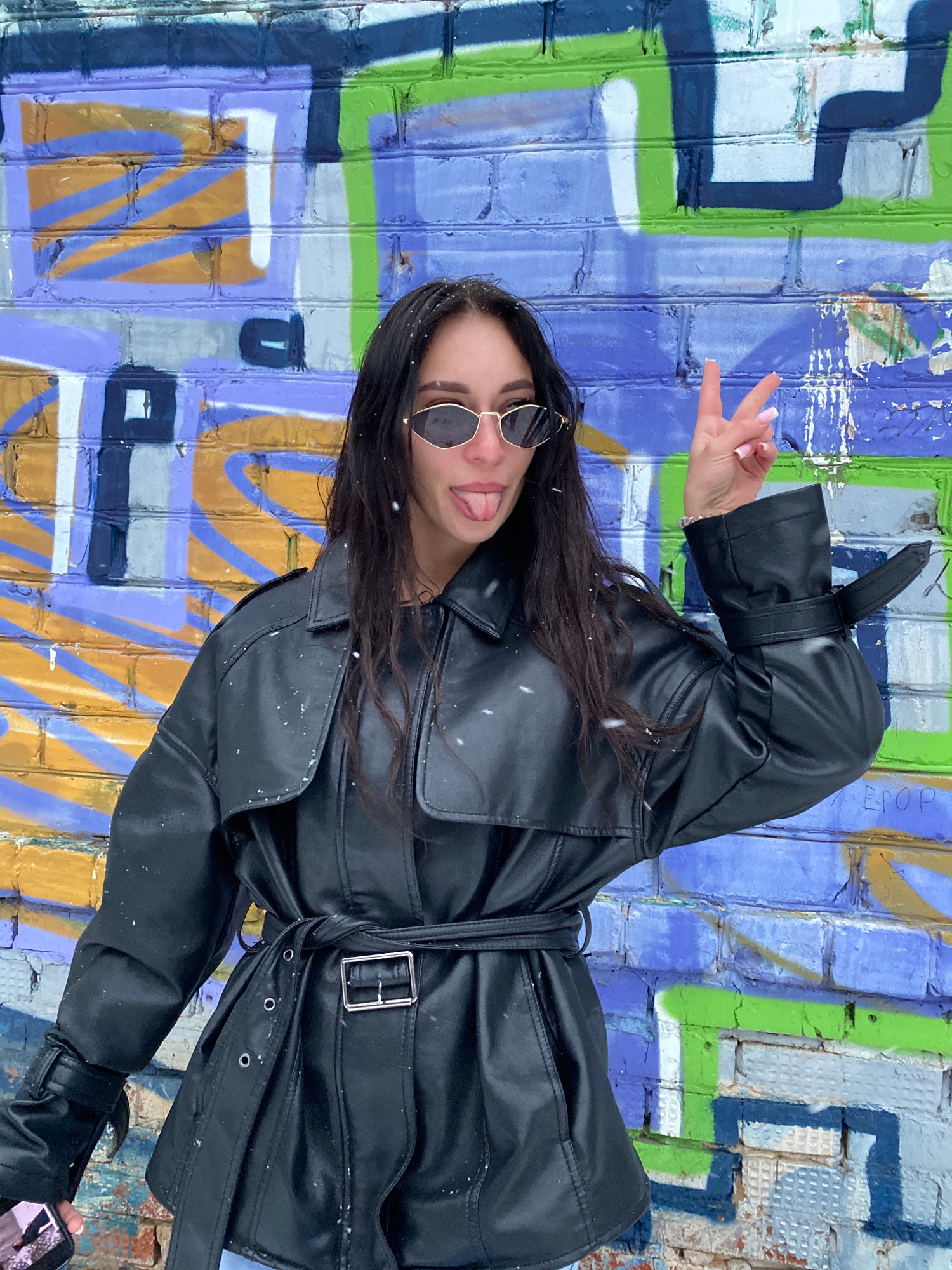A woman with long, dark hair wearing sunglasses and a black leather trench coat stands in front of a brick wall covered in graffiti. She holds up her hand with a peace sign and sticks out her tongue.…read more