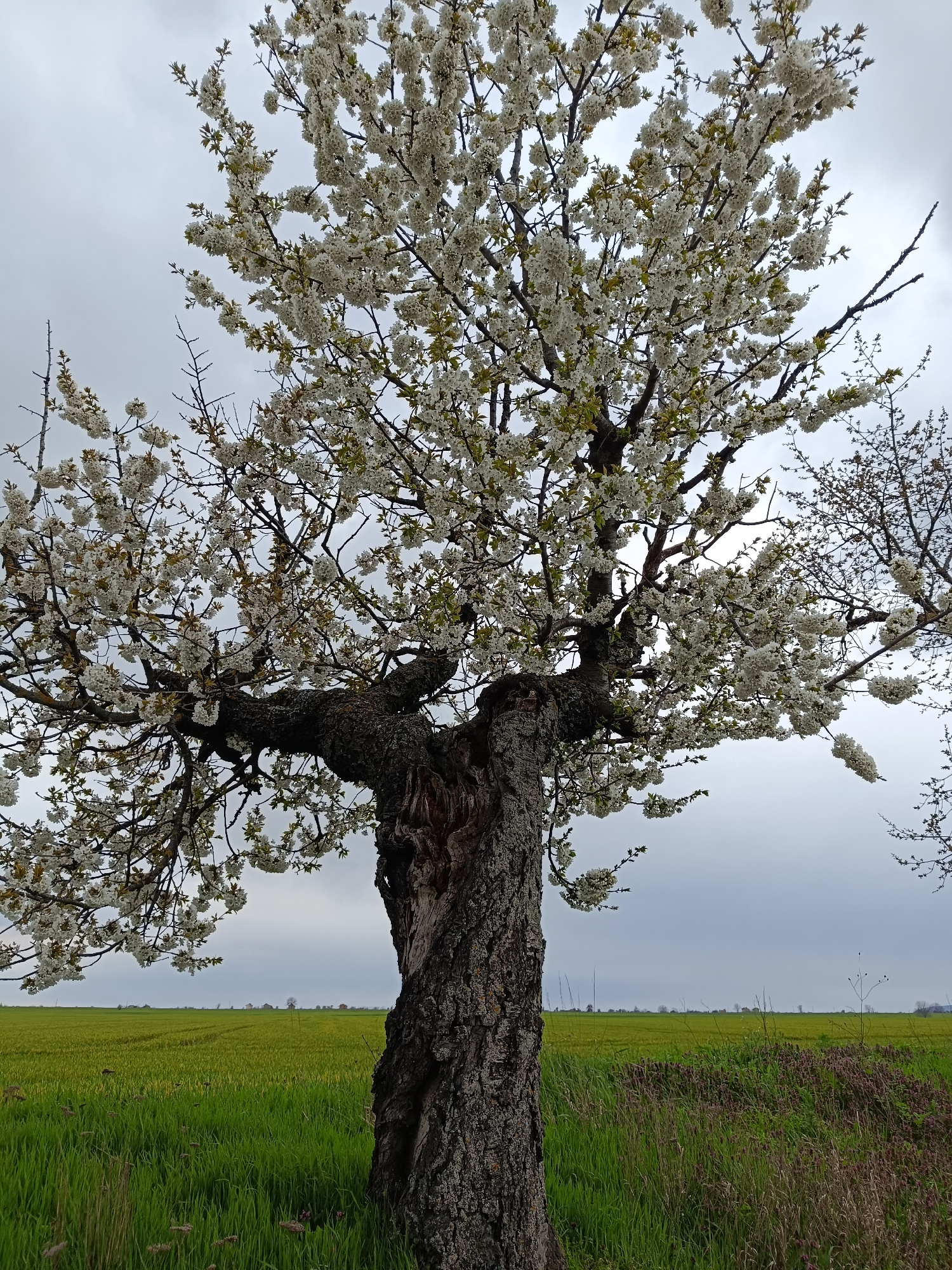 A full-frame, outdoor photograph captures a blossoming tree set against a backdrop of a green field under a cloudy sky. The tree is the primary subject, its trunk displaying a rough, gnarled texture.…read more