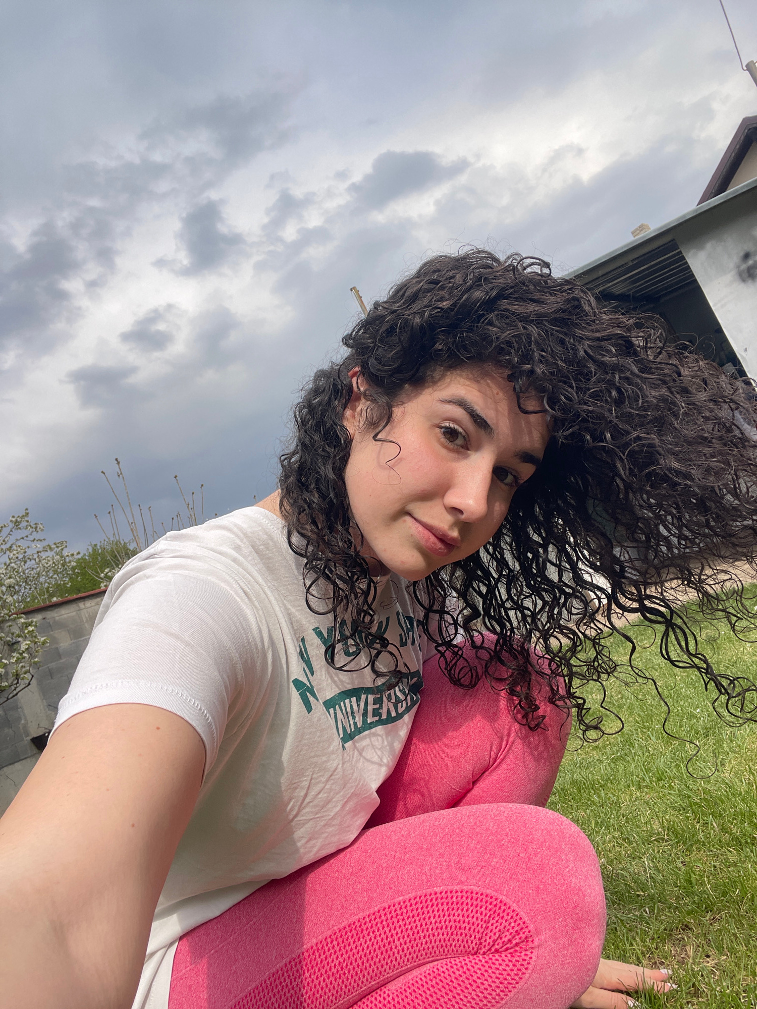 An overhead-style self-portrait captures a young woman outdoors, positioned as if lying on her back or leaning back significantly. Her dark, voluminous curly hair spreads around her head, contrasting…read more