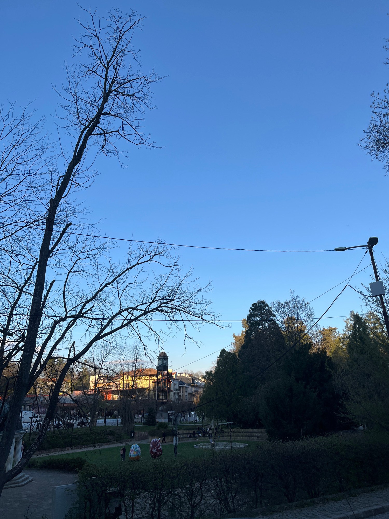 The image depicts an upward view in Bankya, Bulgaria, focusing on a predominantly clear blue sky framed by bare tree branches and a portion of a park. A street lamp and power lines are visible extendi…read more