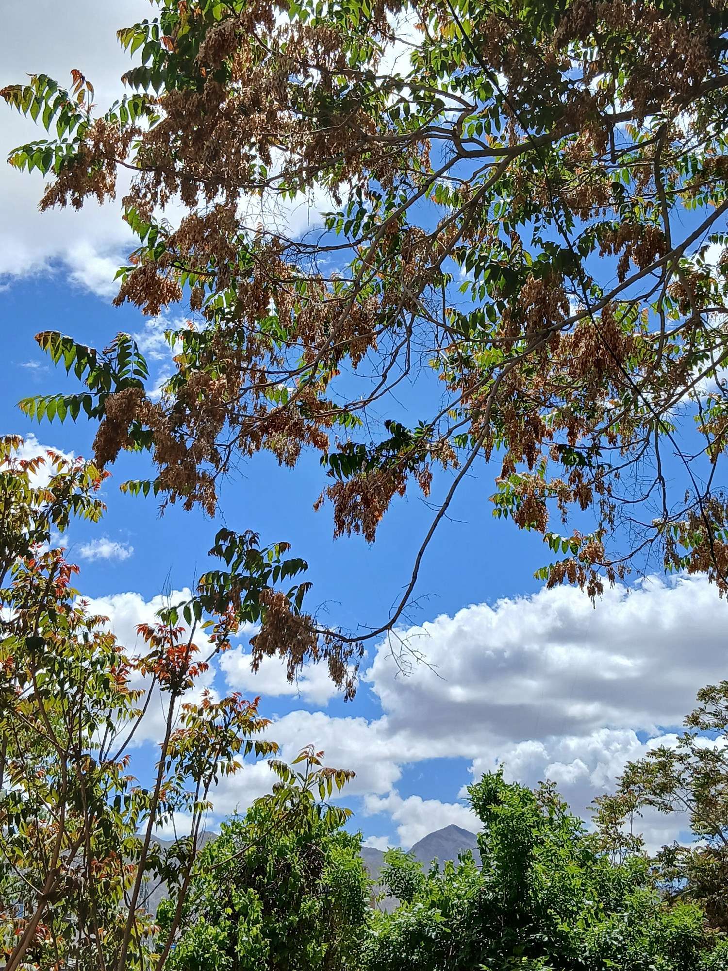 The image shows a view looking up through tree branches towards a blue sky with white clouds. The tree branches are laden with green and brown leaves. A glimpse of a mountain can be seen through the t…read more