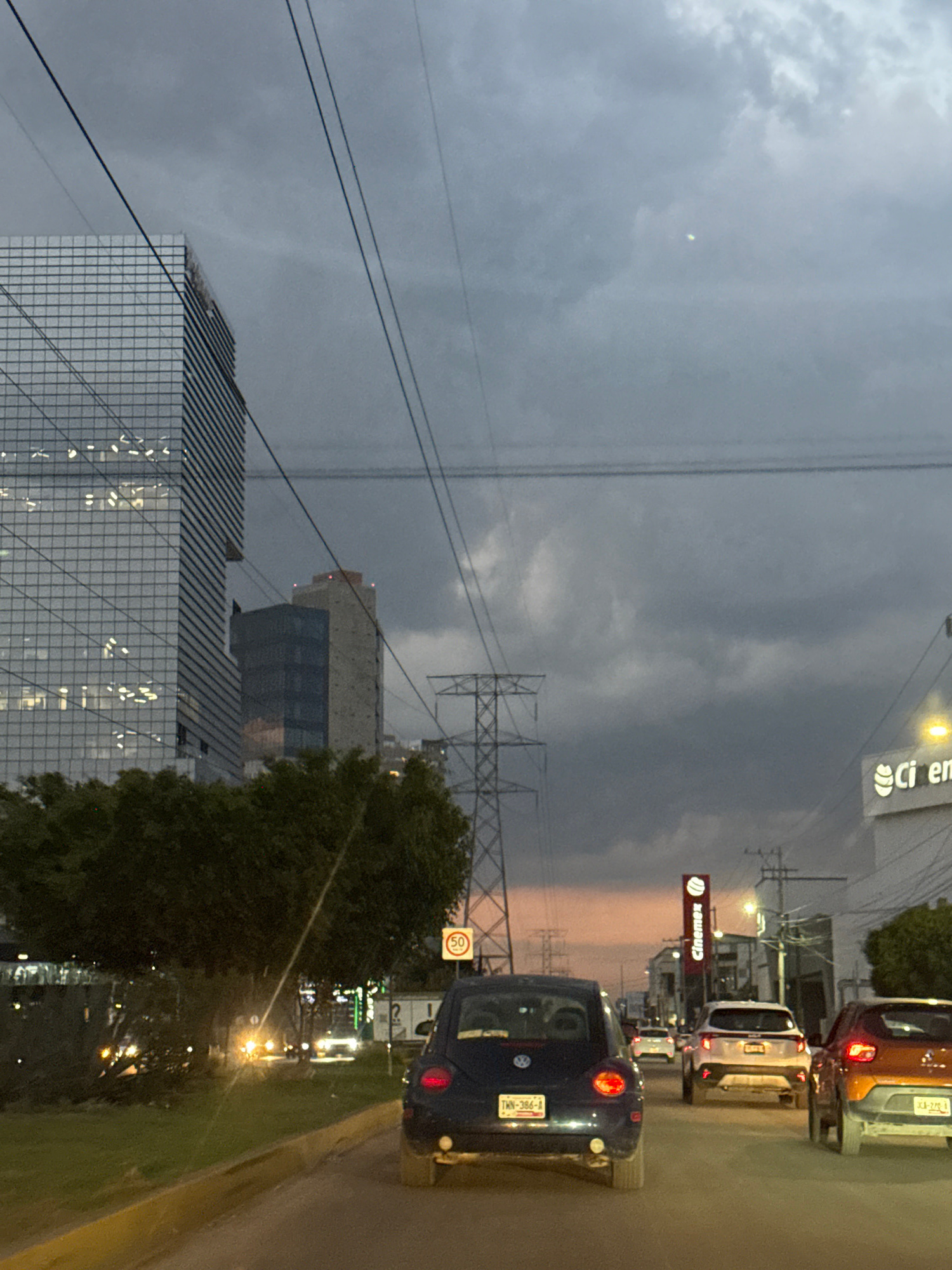 The image shows a street scene in Puebla, Mexico at dusk. A tall, modern office building with a gridded glass facade is visible in the lower left. Behind it and slightly to the right is another taller…read more