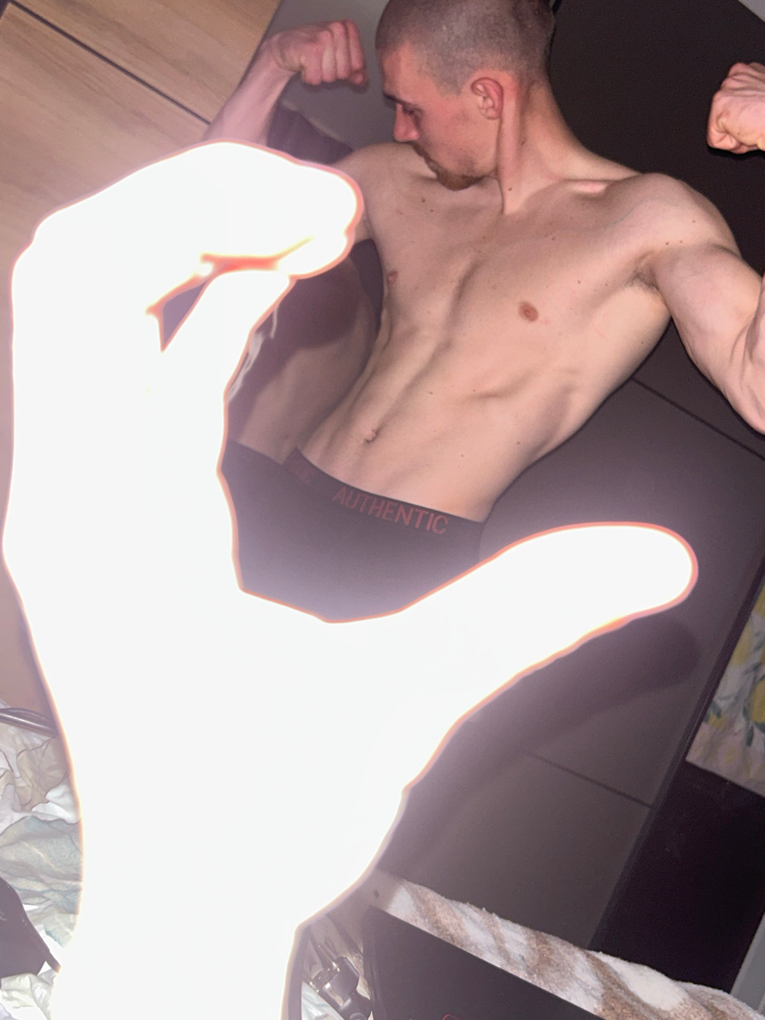 A man with a shaved head and beard is flexing his muscles. He is wearing dark-colored underwear with the word "AUTHENTIC" printed on the waistband. The background includes furniture and bedding. The l…read more