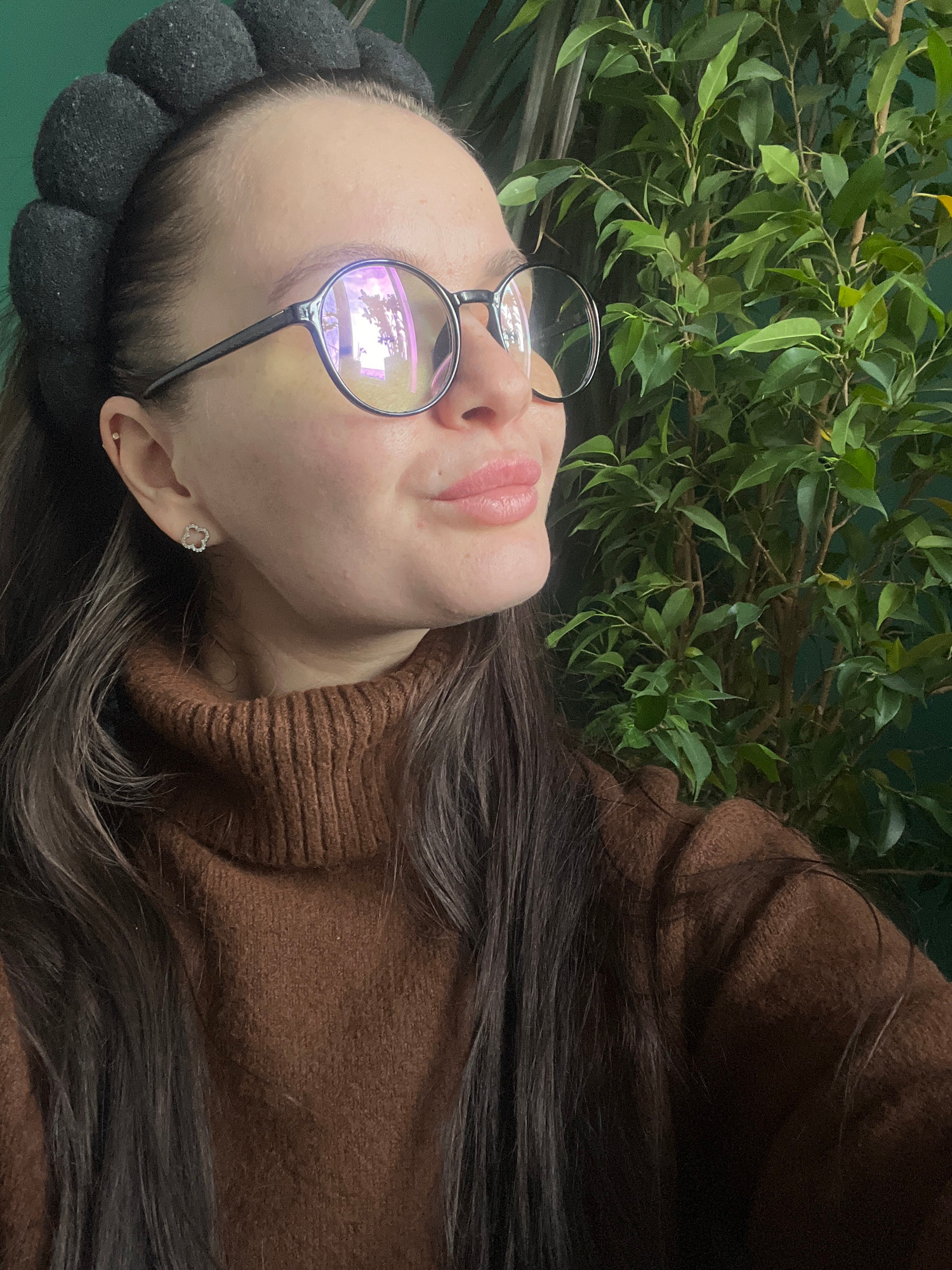A person wearing glasses and a brown sweater lies on their back with a plant behind them. The setting appears to be indoors. The person has dark hair and is wearing earrings shaped like flowers. There…read more