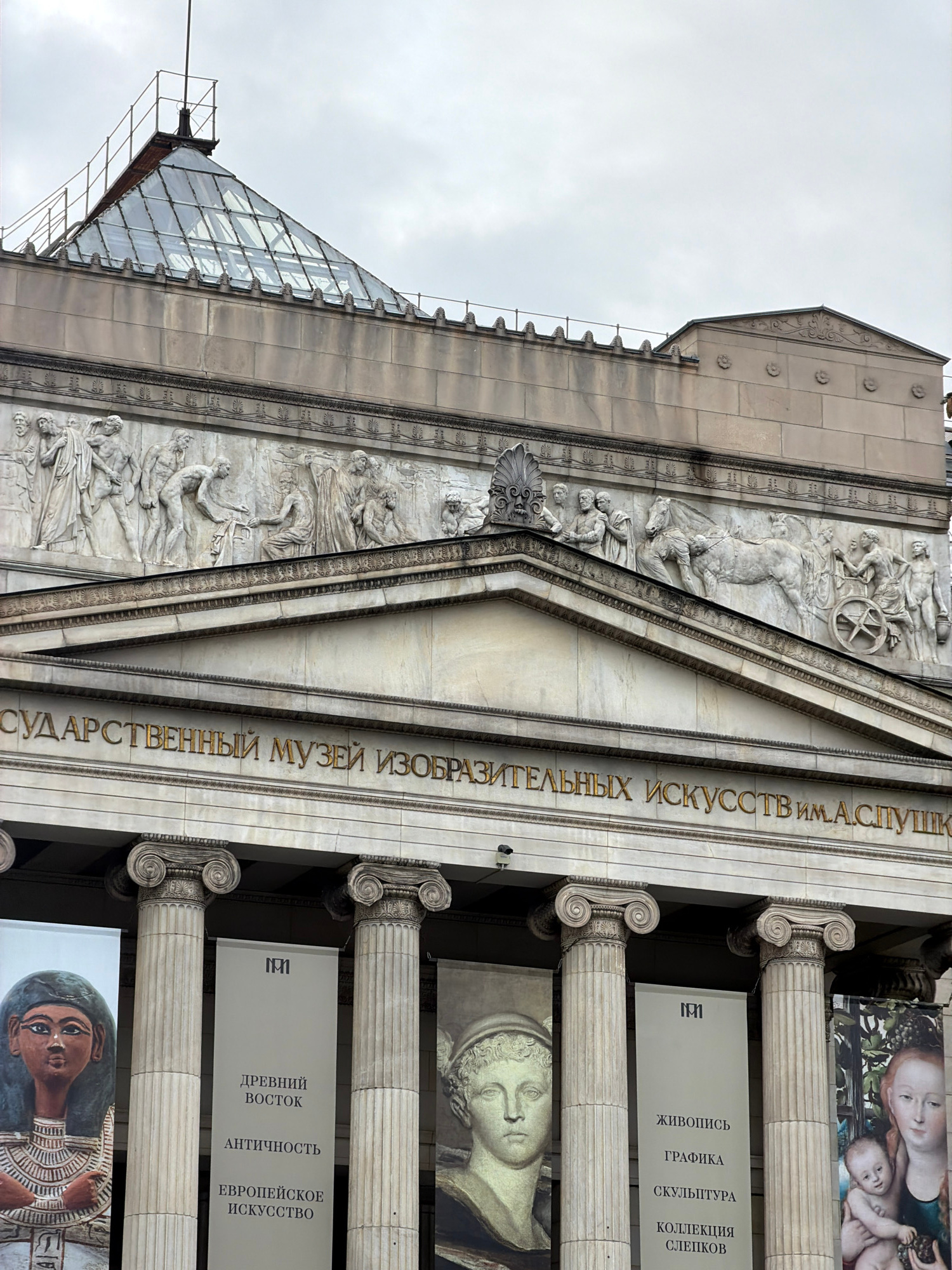 The image displays the grand facade of the Pushkin State Museum of Fine Arts in Moscow, Russia, captured from a low-angle perspective looking upwards. The building exhibits classical architectural ele…read more