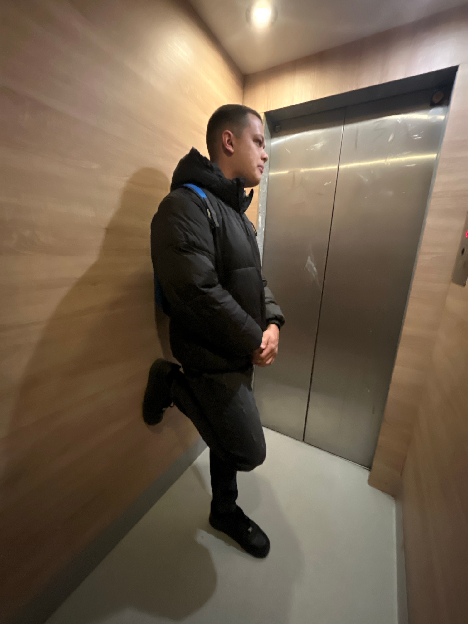 A man is lying on the floor of an elevator. The man is wearing a black puffer jacket, black pants, and black shoes. The elevator has wood paneling on the floor and walls, and a metal door. The locatio…read more