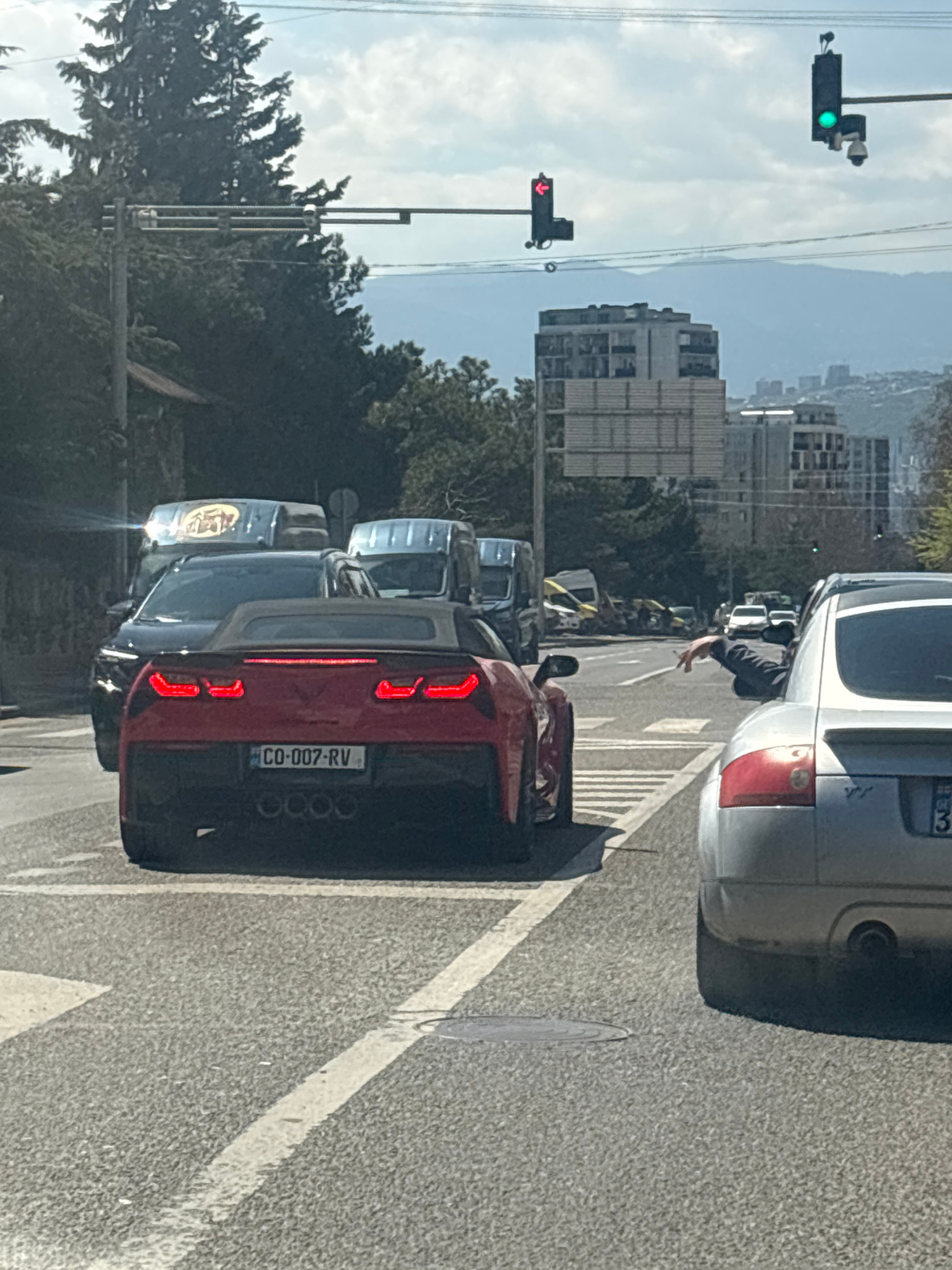 The image shows a street scene in Tbilisi, Georgia. The traffic is stopped at a red traffic light with a red arrow, while the pedestrian traffic light is green. A red car with license plate "CO-007-RV…read more