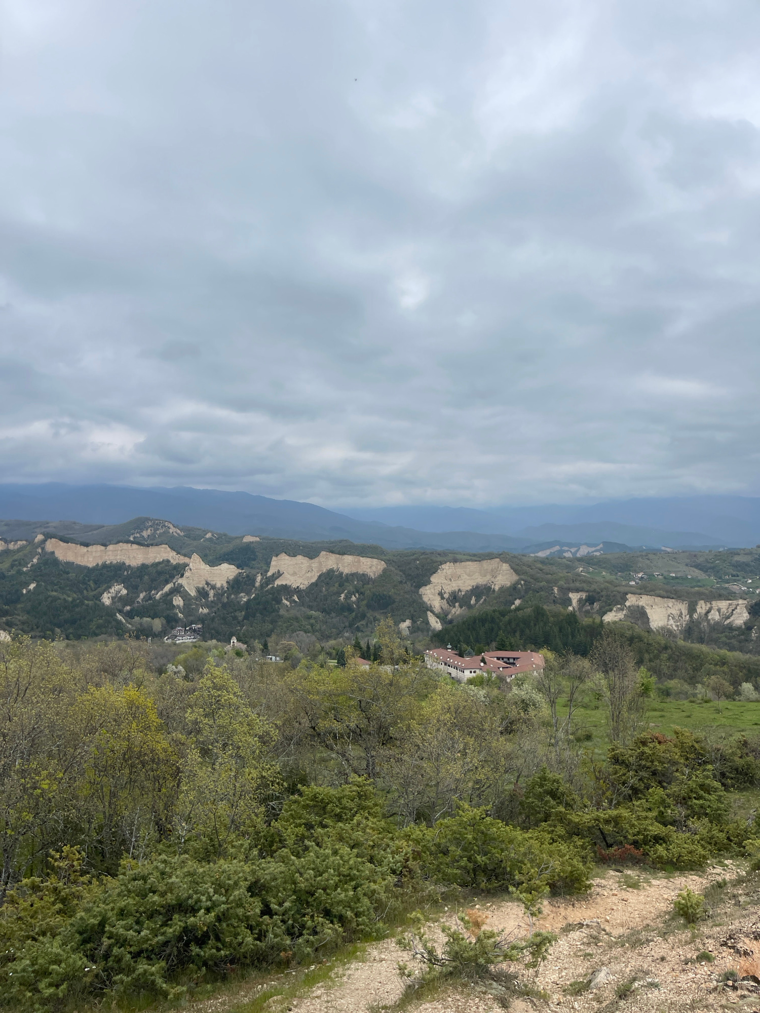 This is an outdoor, daytime shot of a mountainous landscape under a cloudy sky, likely taken from a high vantage point. The view consists of a deep valley with textured rocky terrain interspersed withβ¦read more