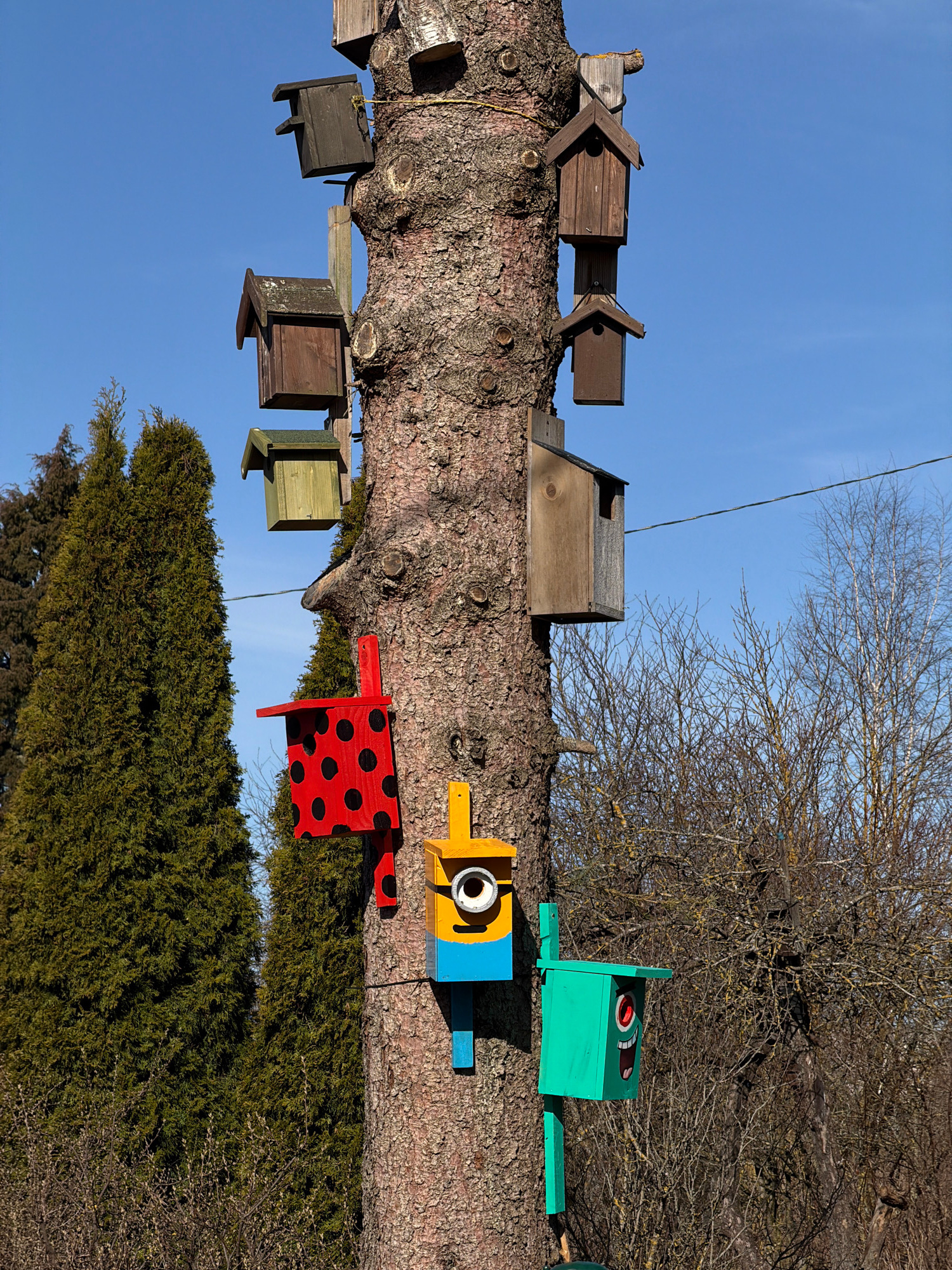 A sideways shot displays a large tree with a variety of birdhouses attached to its trunk, set against a backdrop of a bright blue sky and greenery. The birdhouses are of different shapes, sizes, and c…read more