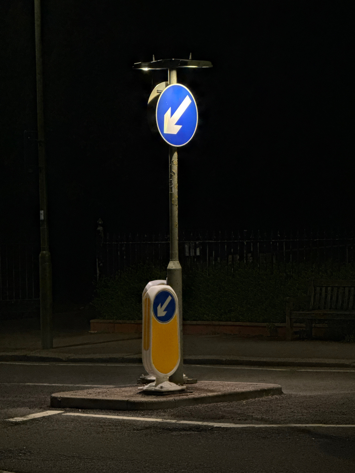 The image captures a nighttime scene on what appears to be a street in London, United Kingdom. The primary subjects are two road signs, both displaying a white arrow pointing diagonally downwards and…read more