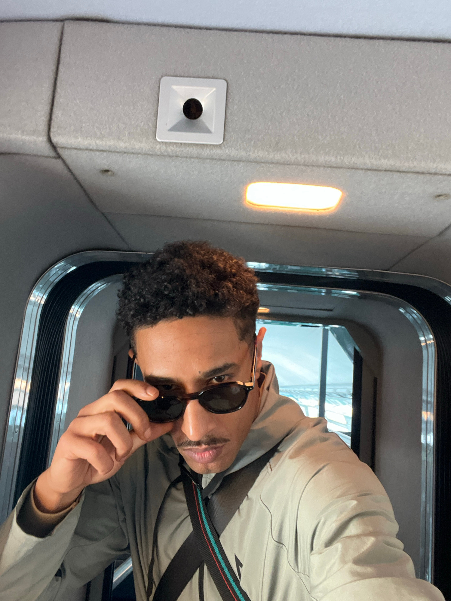 An adult male is depicted in a close-up, self-taken photograph within a modern vehicle cabin, consistent with an Al Boraq high-speed train, likely in or departing from Tanger, Morocco. The subject pos…read more