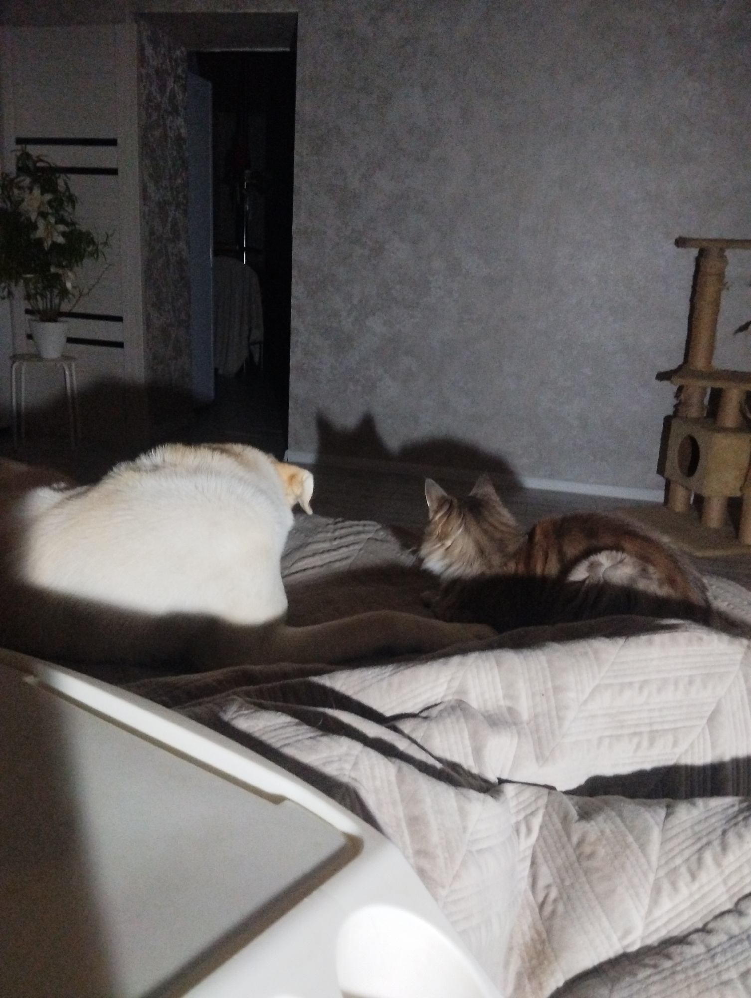 Two animals, a white dog and a brown and white cat, are on a bed in a dimly lit room. The room contains a cat tree in the background. A plant sits on a small table next to a doorway. The location is G…read more