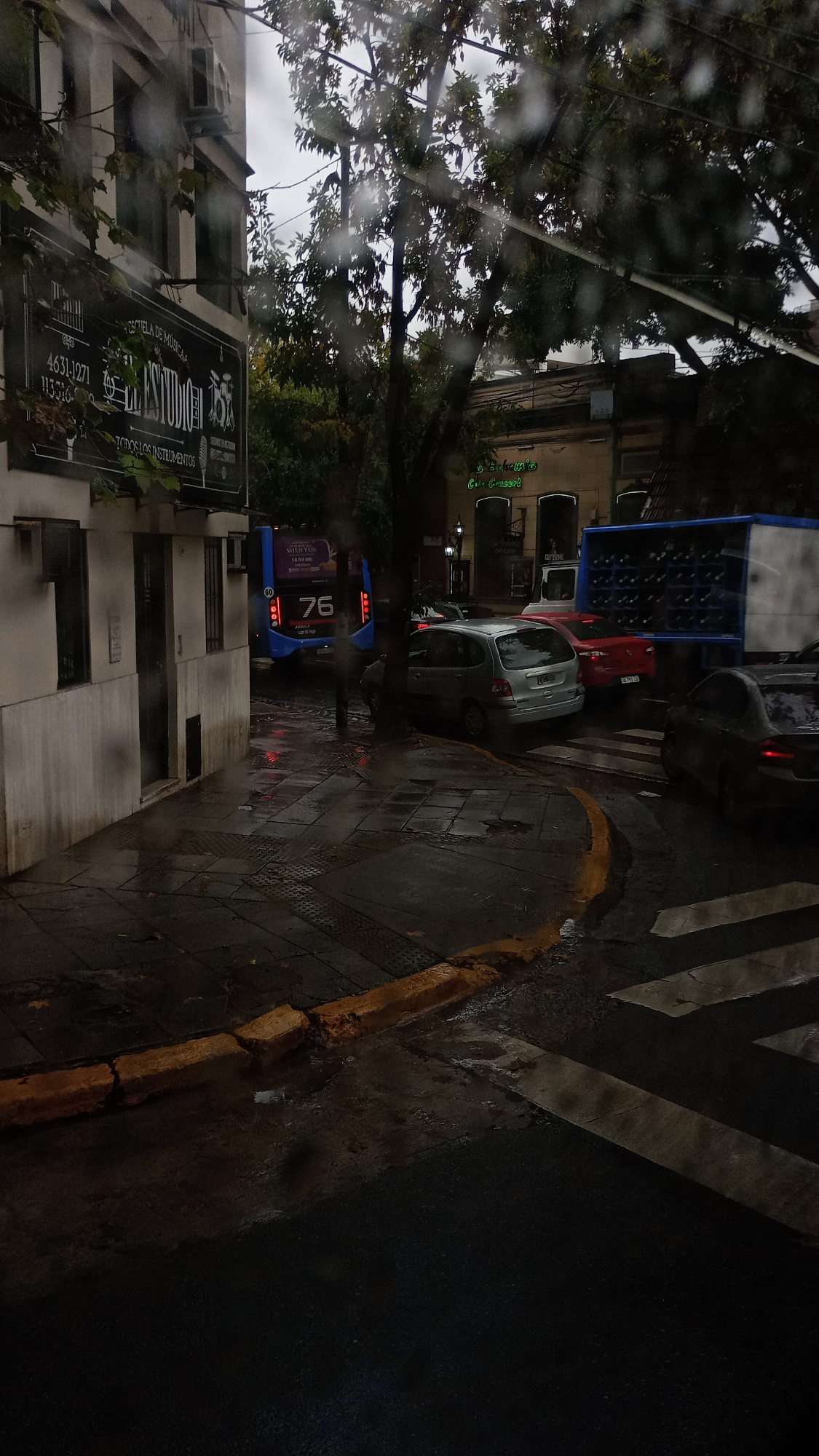 The image depicts a street scene in Buenos Aires, Argentina, on a rainy day. The location features a building on the left with a sign indicating "Escuela de Música" (Music School), with the phone numb…read more