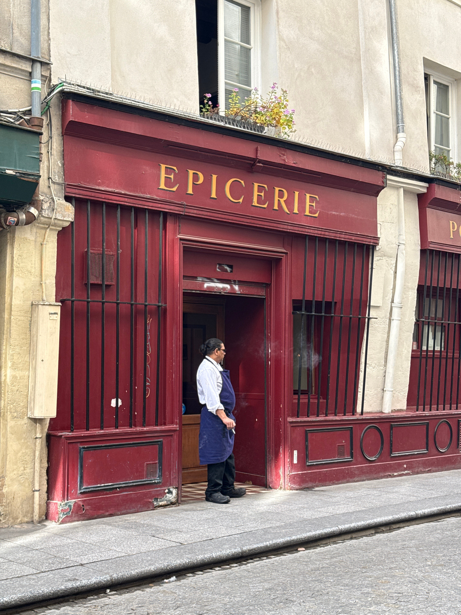 A man stands in the doorway of a small shop in Paris, France. The shop's façade is painted a deep red color. Above the doorway, the word "EPICERIE" is written in gold letters. The man is wearing a whi…read more