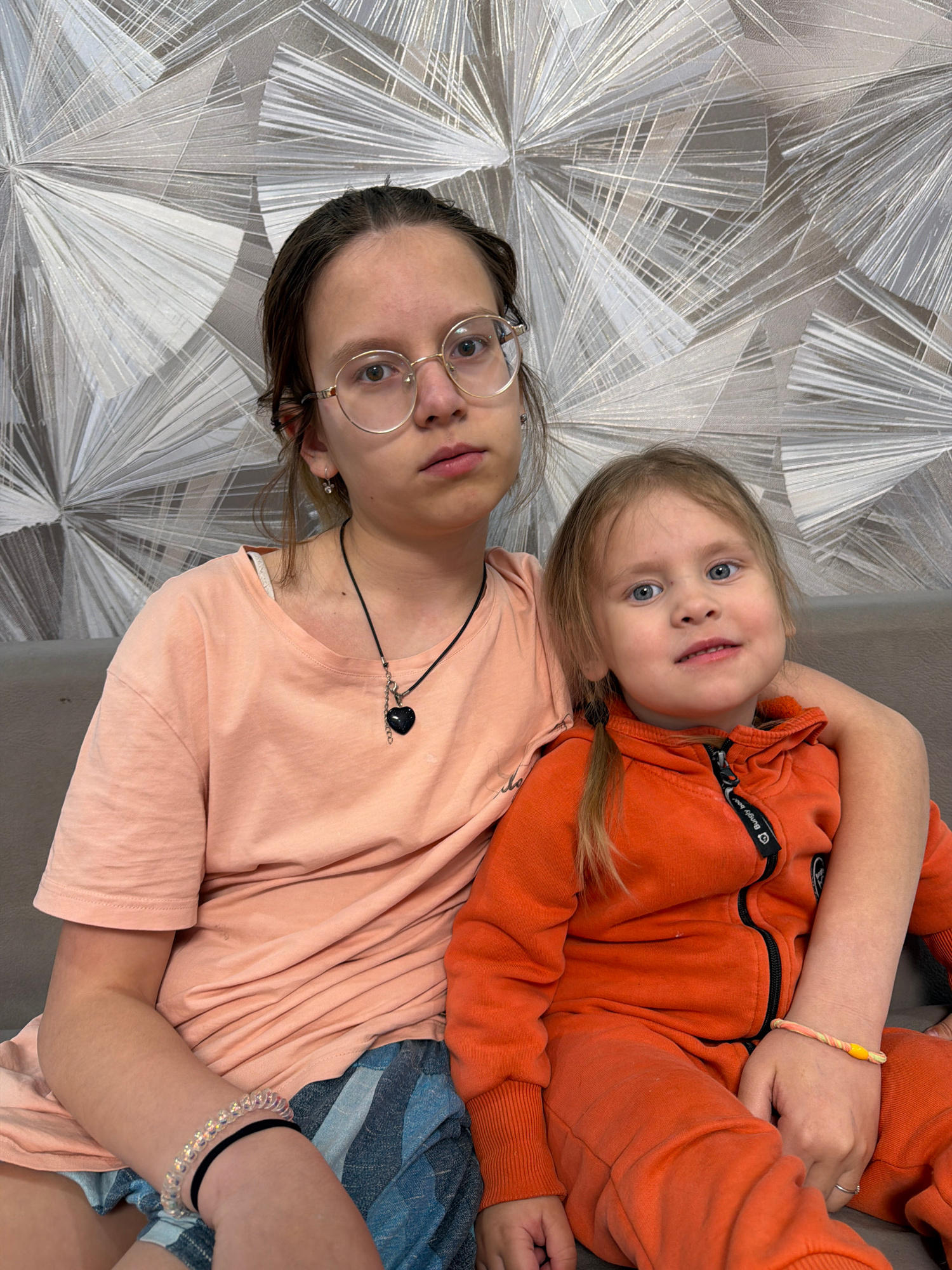 The image captures two individuals: a young girl and an adolescent girl. The young girl is dressed in an orange hooded sweatshirt. Her hair is light blonde and styled into pigtails. The adolescent gir…read more