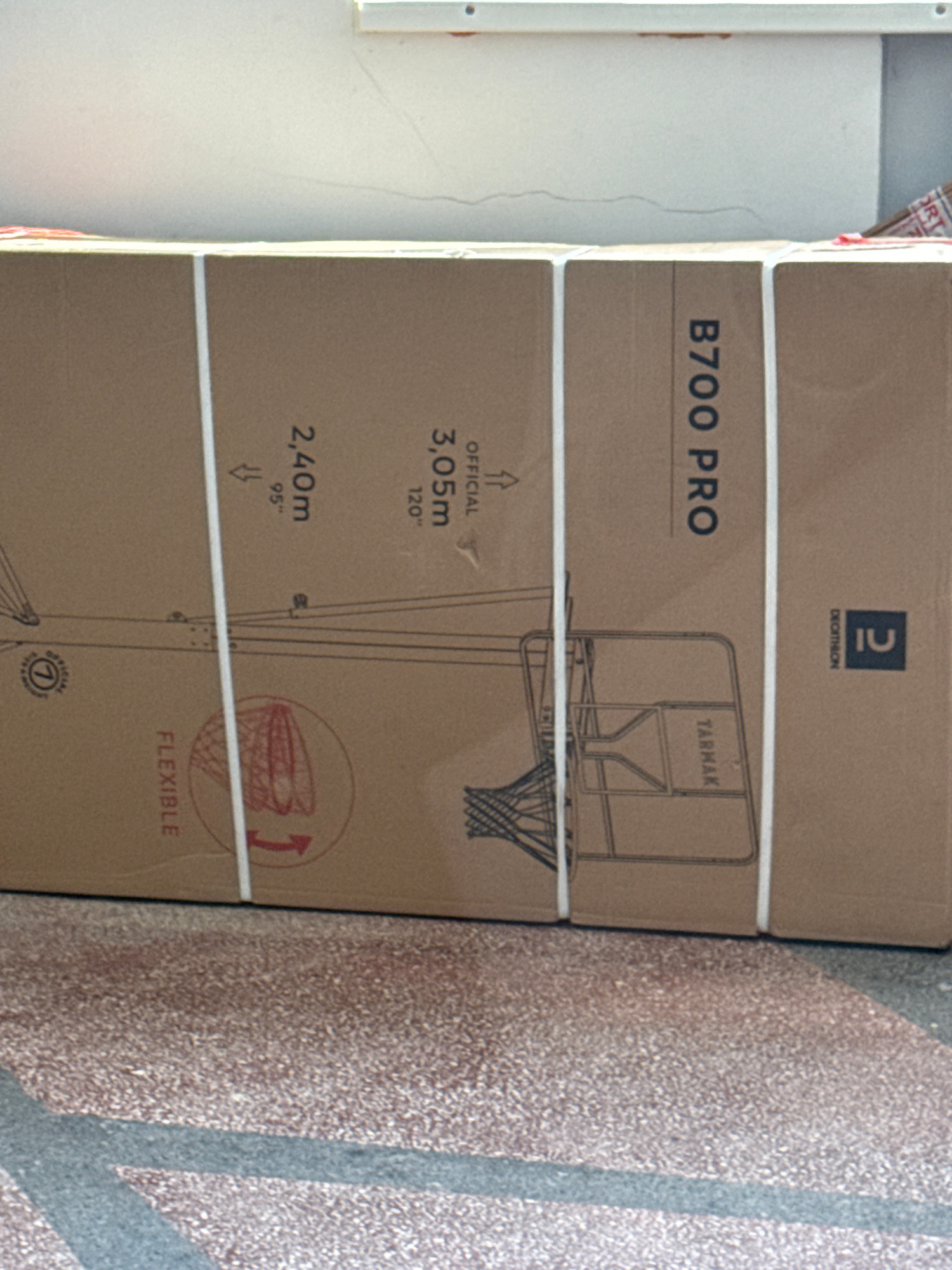 The image captures a large cardboard box, likely containing a basketball hoop, standing upright against a plain white wall. To the right, a textured surface, possibly a floor or wall with a speckled p…read more