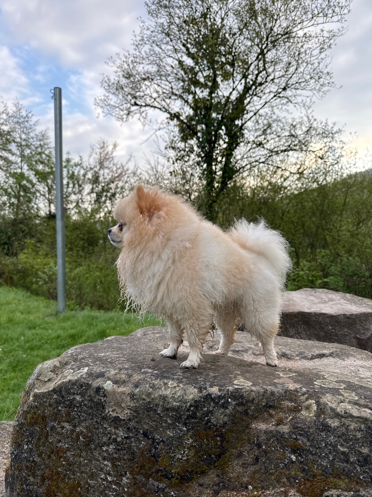 A small, light-tan Pomeranian dog stands on a large, lichen-covered rock formation in Bietigheim-Bissingen, Germany. The dog is positioned in the upper right of the frame, facing left and looking down…read more