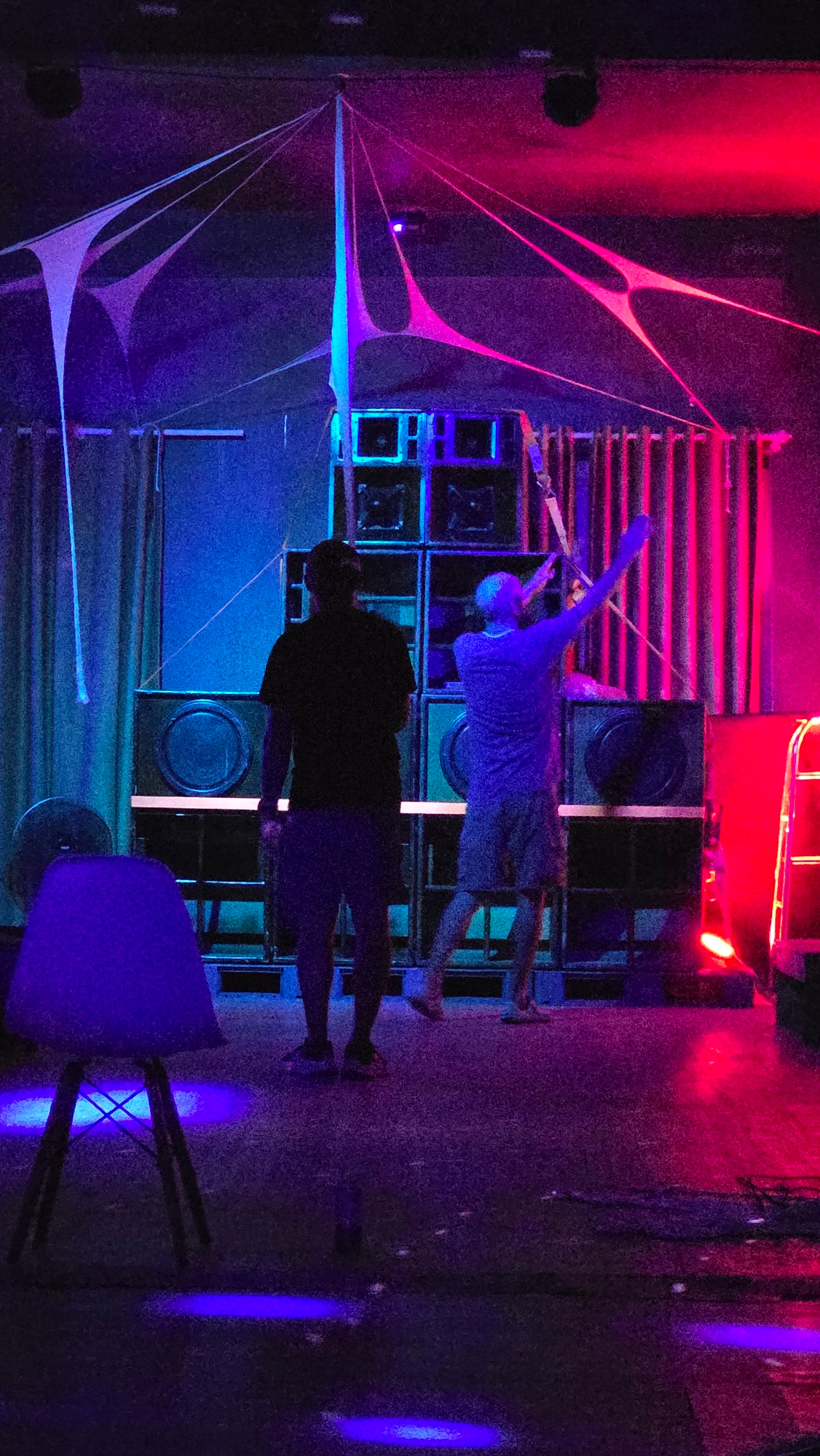 The image depicts an indoor scene in Nha Trang, Vietnam, characterized by vibrant neon lighting, primarily in shades of red, blue, and purple. A stack of speakers is prominently featured, with two ind…read more