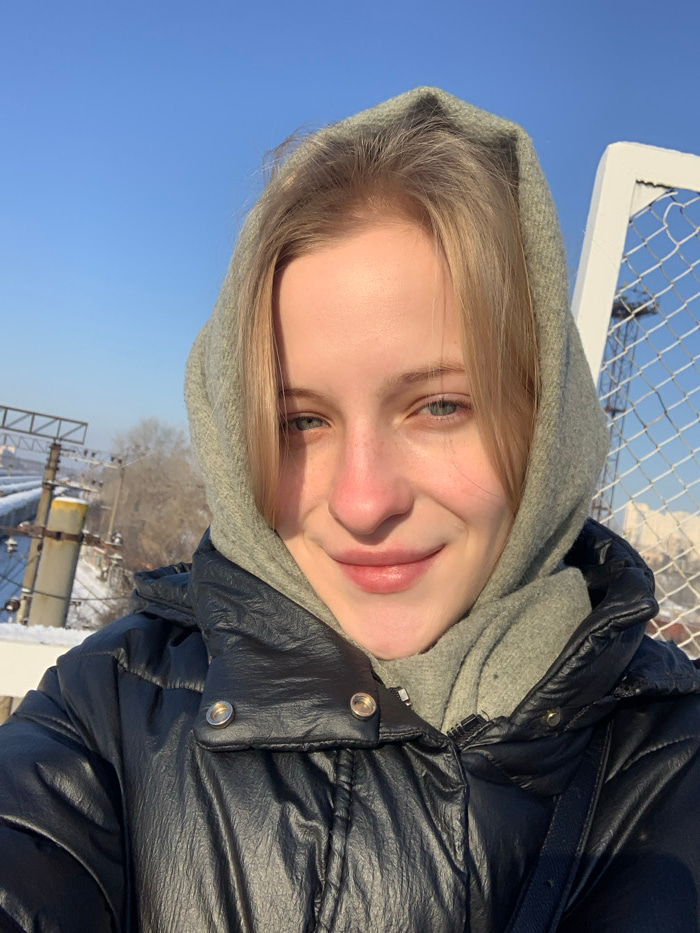 A young female, appearing in her twenties with blonde hair, blue-green eyes, and a fair complexion, smiles directly at the camera. She wears a grey hooded garment around her head and a black, shiny, p…read more
