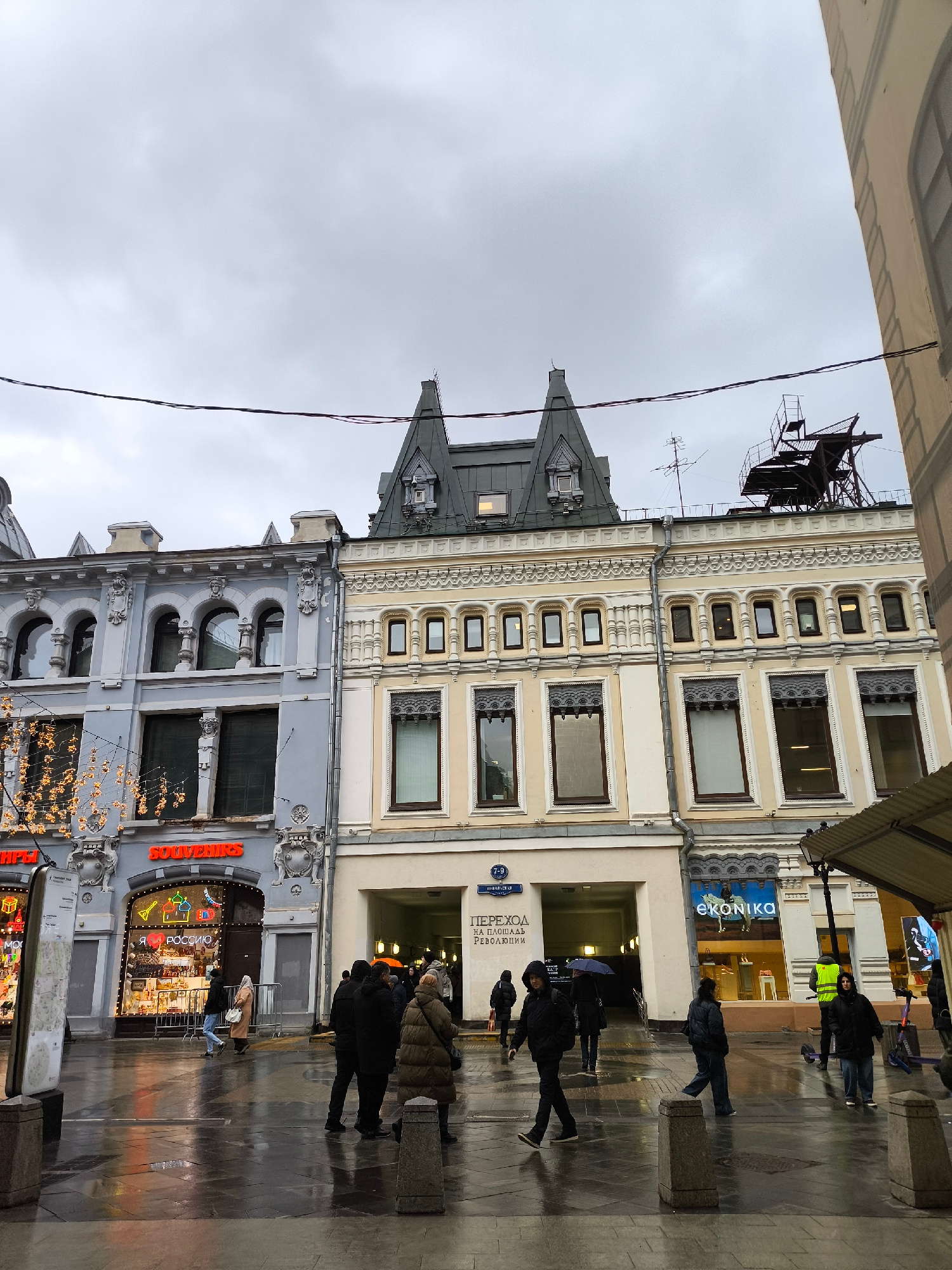 A street scene in an urban environment, likely in Russia based on the Cyrillic text on signage, captured on a cloudy, possibly rainy day. The main subject consists of several buildings with distinct…read more