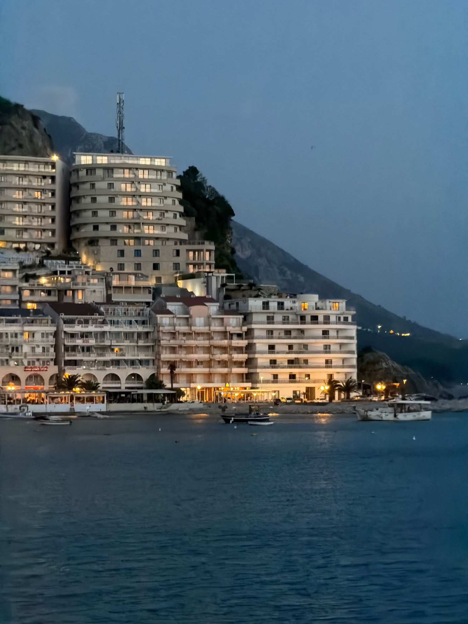 The image depicts a coastal scene in Rafailovići, Montenegro, at dusk. Several tall, white residential buildings dominate the shoreline. The buildings vary in height and architectural style, and many…read more