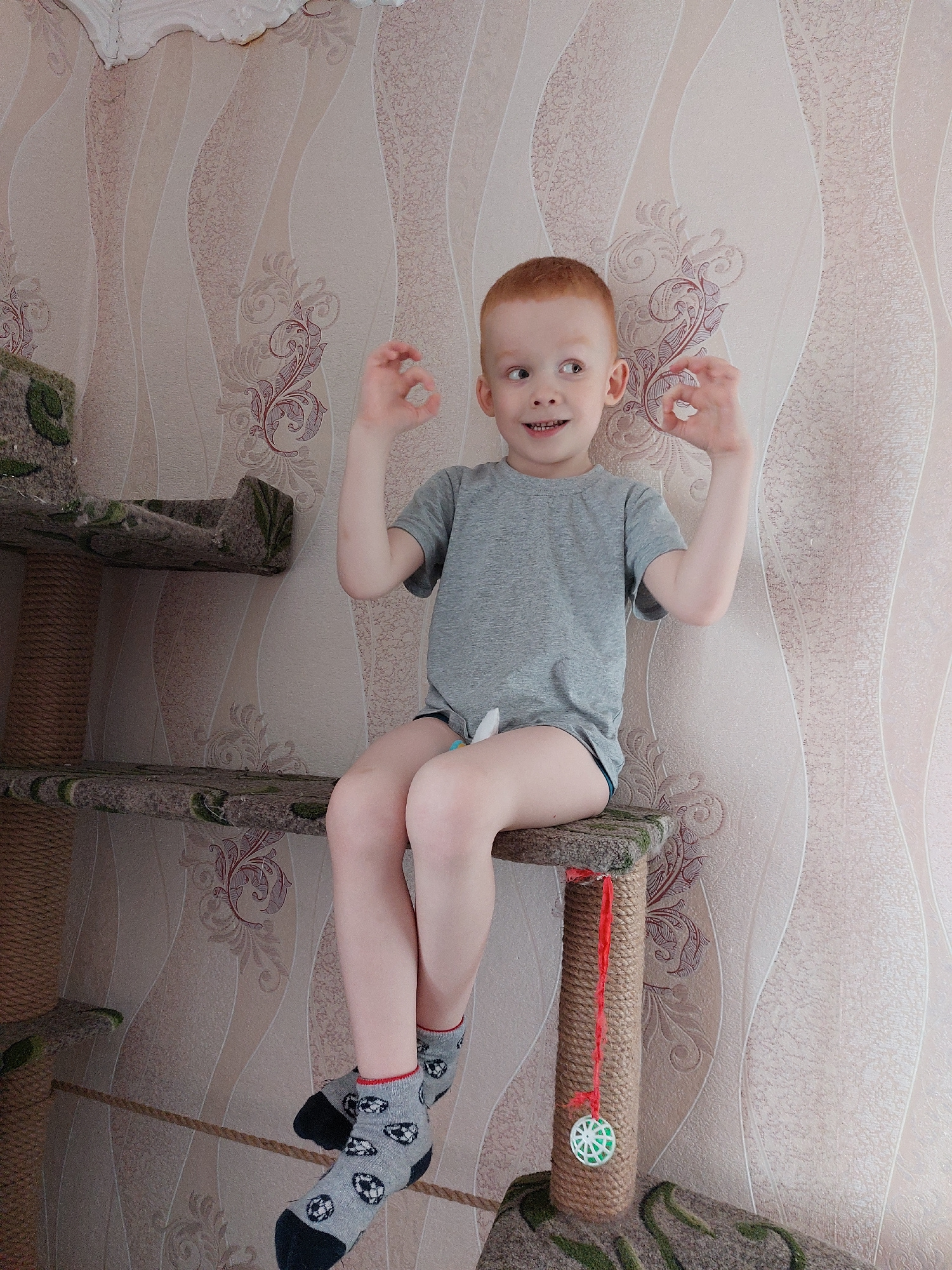 A red-haired child wearing a gray t-shirt and socks with soccer ball patterns is lying on a cat tree in front of a wallpapered wall, in Большой Букор, Russia. The child is smiling and holding his hand…read more