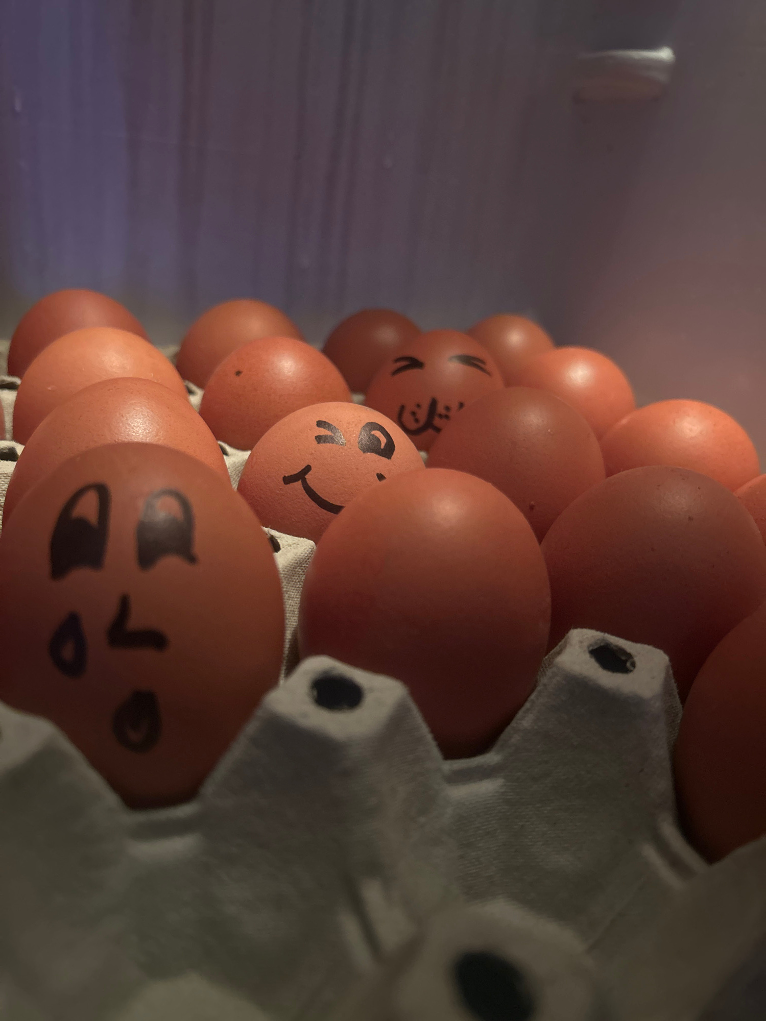 A close-up, angled shot depicts a carton of brown eggs, some of which have faces drawn on them in black marker. The eggs are arranged in a typical cardboard egg carton, which is visible on the right s…read more